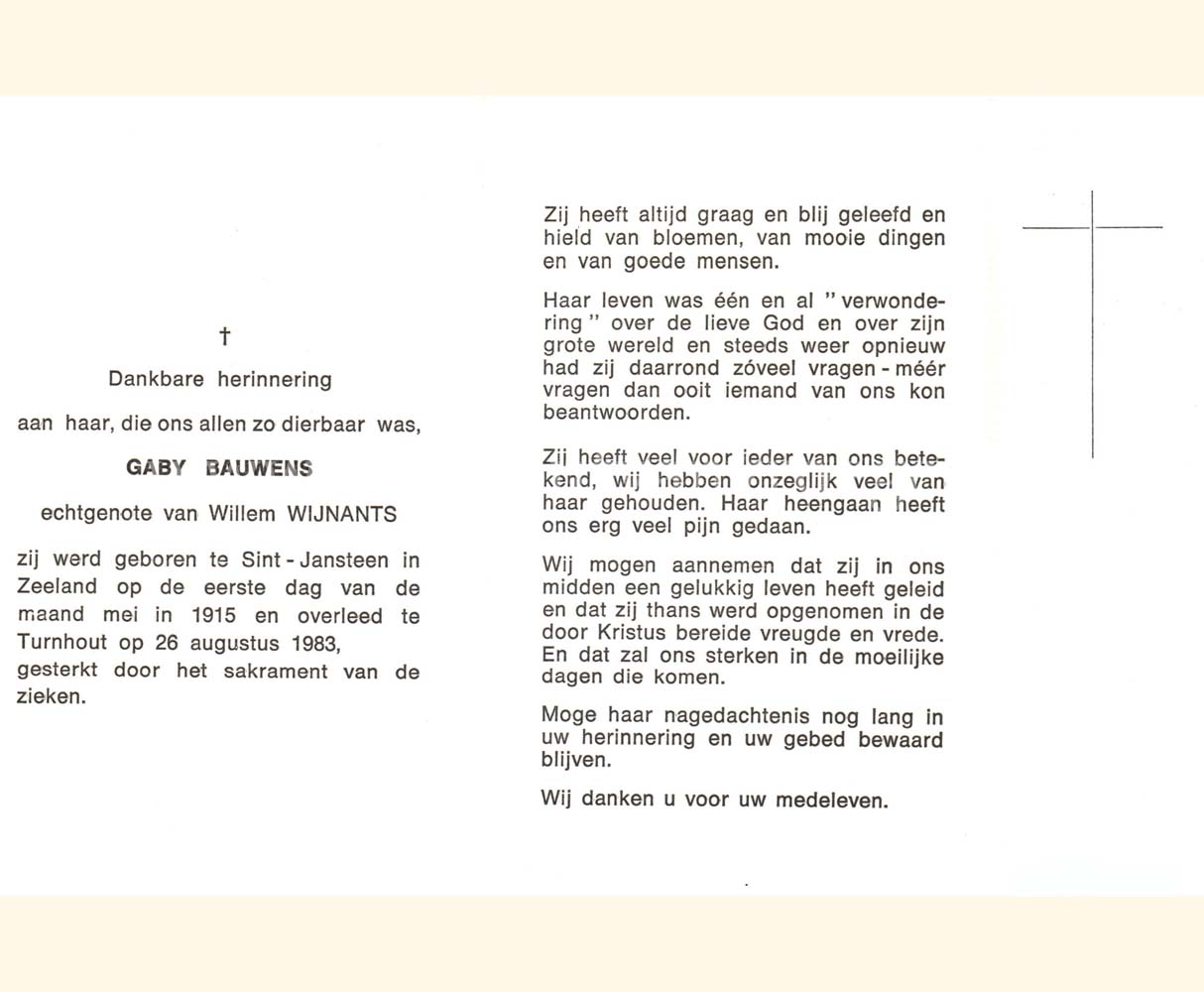 Wij willen met deze website niemand kwetsen of beledigen, het is enkel de bedoeling om genealogische informatie weer te geven.  Daarenboven hechten we veel belang aan ieders privacy.  Heeft u bezwaar tegen de vermelding van een bidprentje van één van uw familieleden die de afgelopen 50 jaar overleden zijn, stuur dan een mailtje naar info@smartsitesolutions.be.
