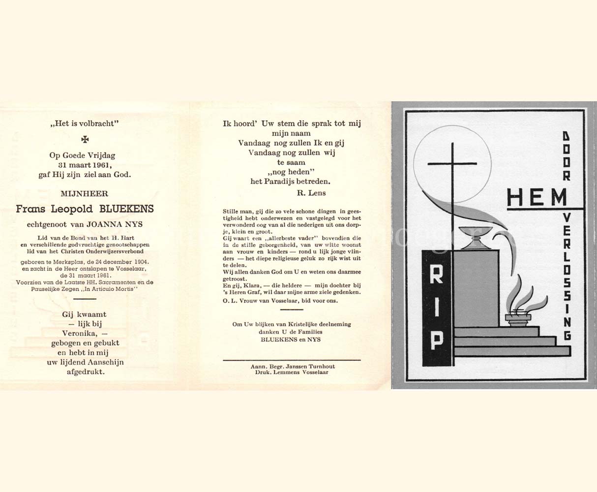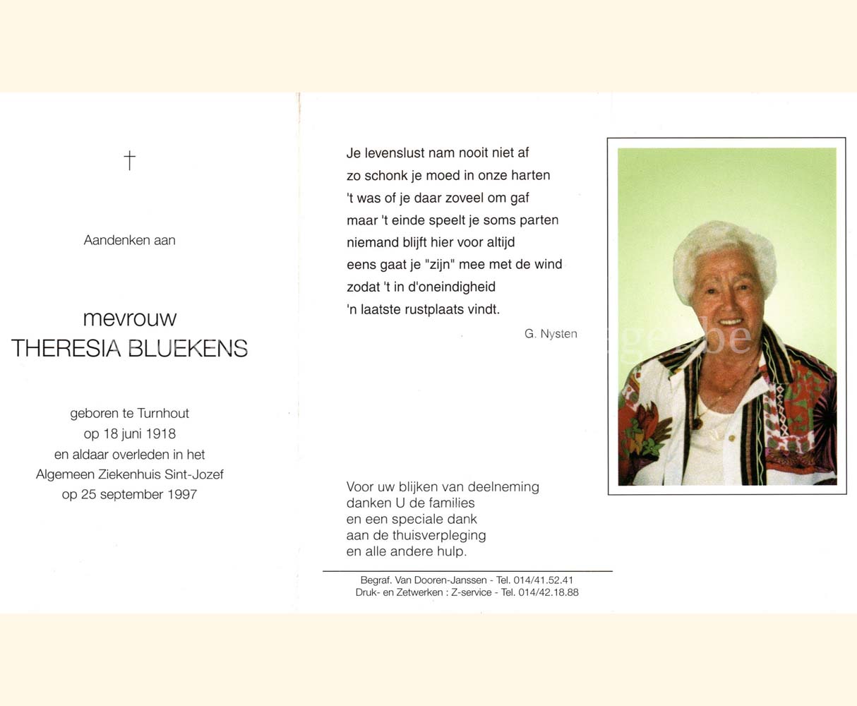 Wij willen met deze website niemand kwetsen of beledigen, het is enkel de bedoeling om genealogische informatie weer te geven.  Daarenboven hechten we veel belang aan ieders privacy.  Heeft u bezwaar tegen de vermelding van een bidprentje van één van uw familieleden die de afgelopen 50 jaar overleden zijn, stuur dan een mailtje naar info@smartsitesolutions.be.
