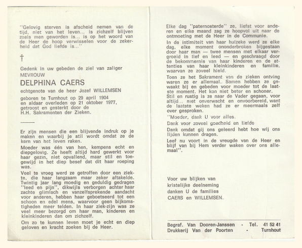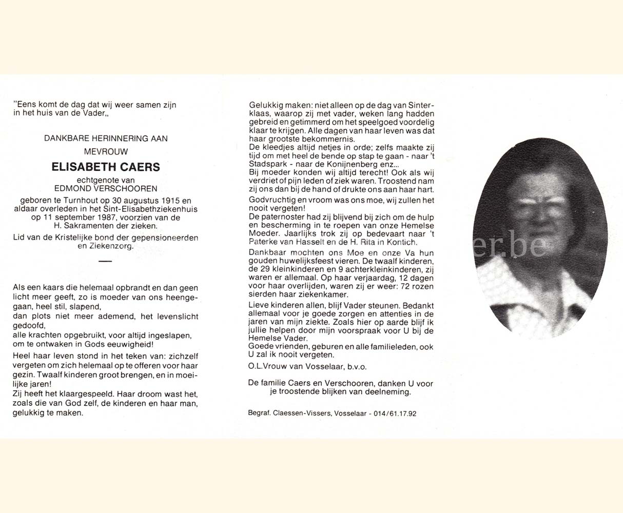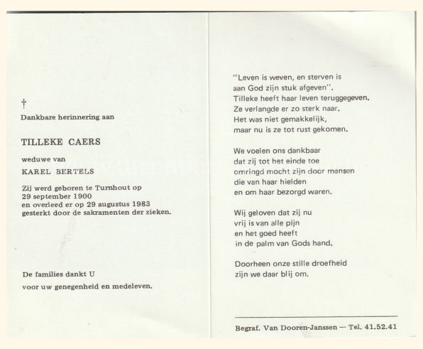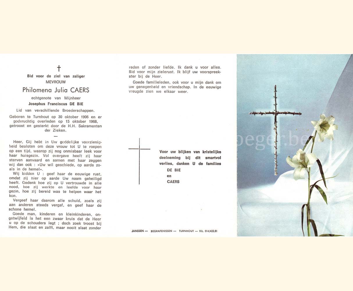 Wij willen met deze website niemand kwetsen of beledigen, het is enkel de bedoeling om genealogische informatie weer te geven. Daarenboven hechten we veel belang aan ieders privacy. Heeft u bezwaar tegen de vermelding van een bidprentje van één van uw familieleden die de afgelopen 50 jaar overleden zijn, stuur dan een mailtje naar info@smartsitesolutions.be.