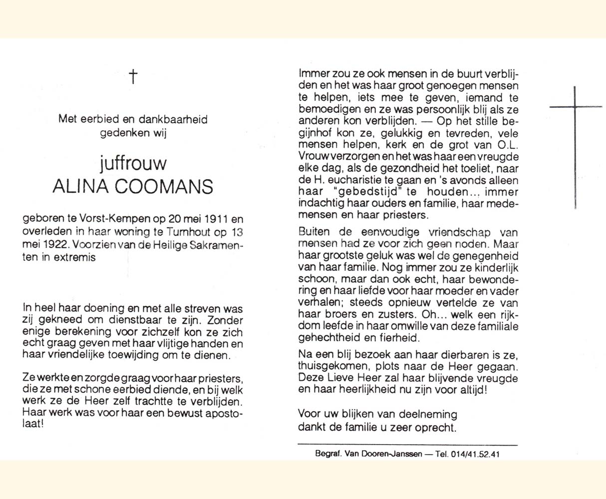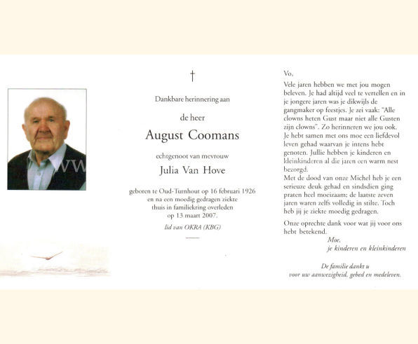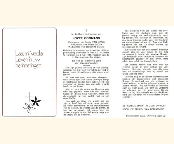 Wij willen met deze website niemand kwetsen of beledigen, het is enkel de bedoeling om genealogische informatie weer te geven.  Daarenboven hechten we veel belang aan ieders privacy.  Heeft u bezwaar tegen de vermelding van een bidprentje van één van uw familieleden die de afgelopen 50 jaar overleden zijn, stuur dan een mailtje naar info@smartsitesolutions.be.