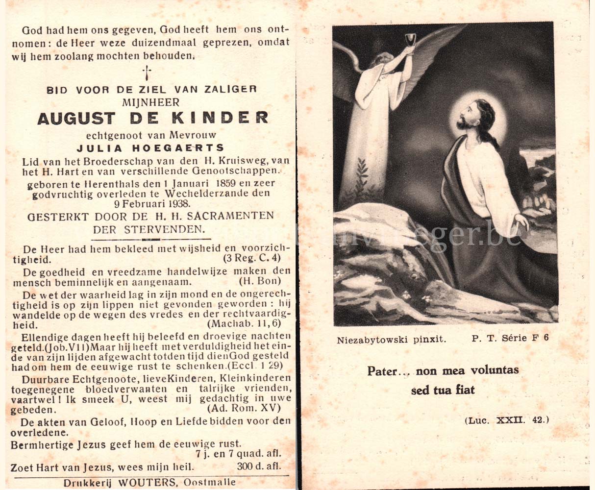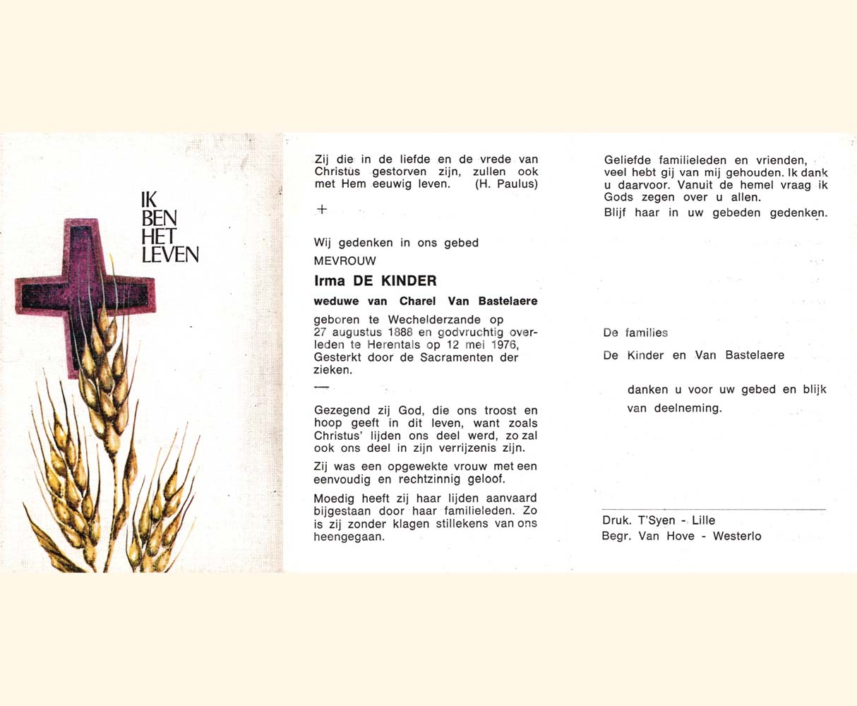 Wij willen met deze website niemand kwetsen of beledigen, het is enkel de bedoeling om genealogische informatie weer te geven.  Daarenboven hechten we veel belang aan ieders privacy.  Heeft u bezwaar tegen de vermelding van een bidprentje van één van uw familieleden die de afgelopen 50 jaar overleden zijn, stuur dan een mailtje naar info@smartsitesolutions.be.