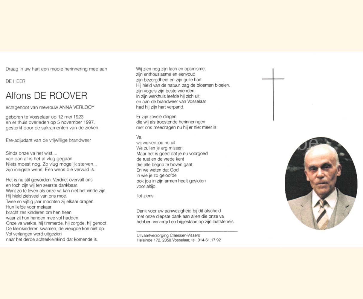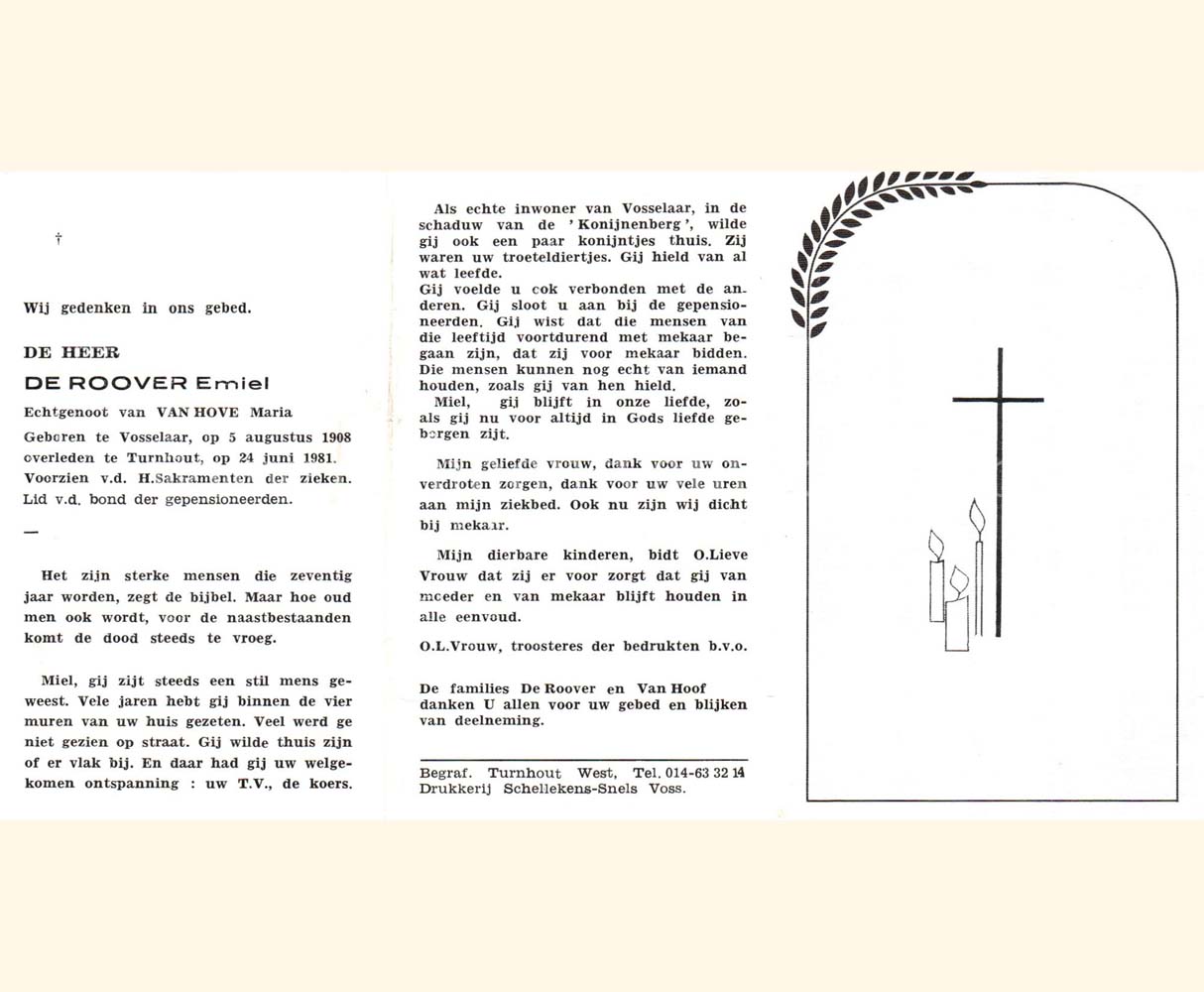 Wij willen met deze website niemand kwetsen of beledigen, het is enkel de bedoeling om genealogische informatie weer te geven.  Daarenboven hechten we veel belang aan ieders privacy.  Heeft u bezwaar tegen de vermelding van een bidprentje van één van uw familieleden die de afgelopen 50 jaar overleden zijn, stuur dan een mailtje naar info@smartsitesolutions.be.