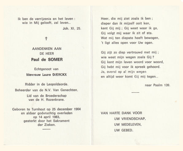 Wij willen met deze website niemand kwetsen of beledigen, het is enkel de bedoeling om genealogische informatie weer te geven. Daarenboven hechten we veel belang aan ieders privacy. Heeft u bezwaar tegen de vermelding van een bidprentje van één van uw familieleden die de afgelopen 50 jaar overleden zijn, stuur dan een mailtje naar info@smartsitesolutions.be.