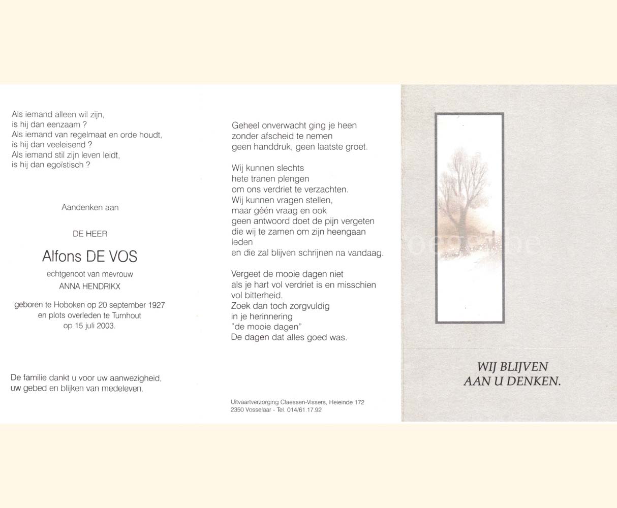 Wij willen met deze website niemand kwetsen of beledigen, het is enkel de bedoeling om genealogische informatie weer te geven.  Daarenboven hechten we veel belang aan ieders privacy.  Heeft u bezwaar tegen de vermelding van een bidprentje van één van uw familieleden die de afgelopen 50 jaar overleden zijn, stuur dan een mailtje naar info@smartsitesolutions.be.