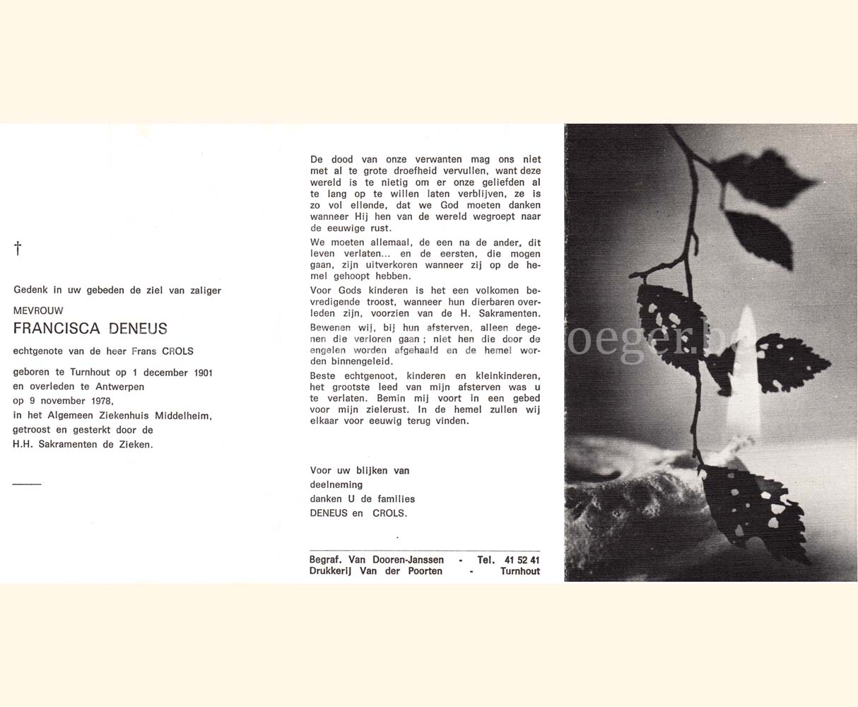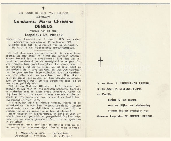 Wij willen met deze website niemand kwetsen of beledigen, het is enkel de bedoeling om genealogische informatie weer te geven.  Daarenboven hechten we veel belang aan ieders privacy.  Heeft u bezwaar tegen de vermelding van een bidprentje van één van uw familieleden die de afgelopen 50 jaar overleden zijn, stuur dan een mailtje naar info@smartsitesolutions.be.