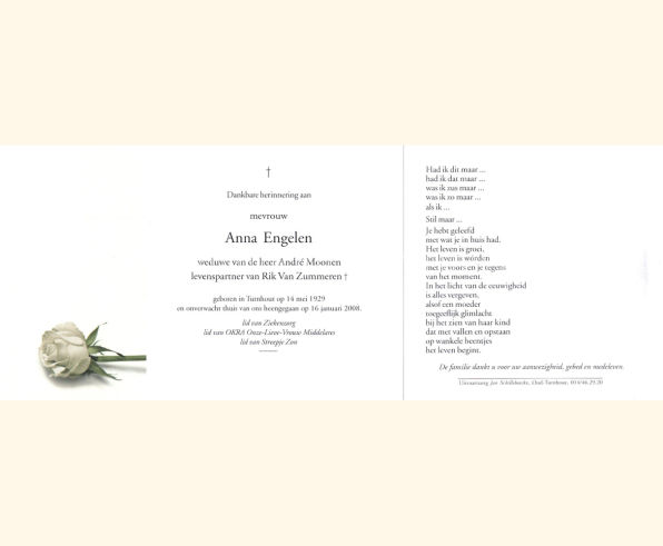 Wij willen met deze website niemand kwetsen of beledigen, het is enkel de bedoeling om genealogische informatie weer te geven.  Daarenboven hechten we veel belang aan ieders privacy.  Heeft u bezwaar tegen de vermelding van een bidprentje van één van uw familieleden die de afgelopen 50 jaar overleden zijn, stuur dan een mailtje naar info@smartsitesolutions.be.
