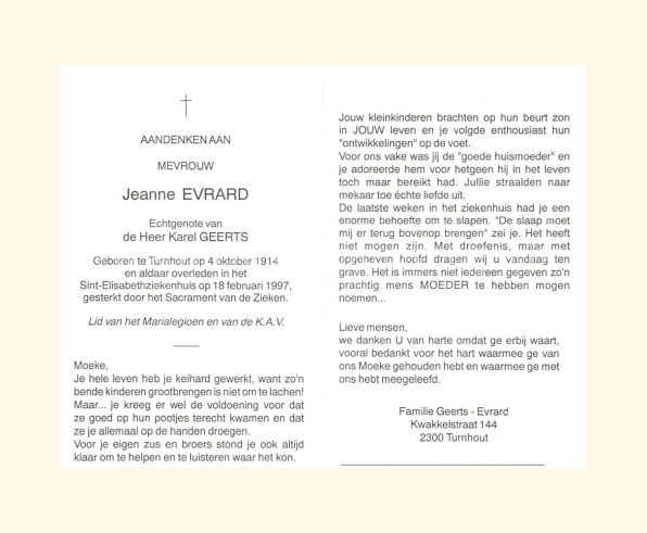 Wij willen met deze website niemand kwetsen of beledigen, het is enkel de bedoeling om genealogische informatie weer te geven.  Daarenboven hechten we veel belang aan ieders privacy.  Heeft u bezwaar tegen de vermelding van een bidprentje van één van uw familieleden die de afgelopen 50 jaar overleden zijn, stuur dan een mailtje naar info@smartsitesolutions.be.