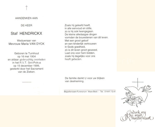 Wij willen met deze website niemand kwetsen of beledigen, het is enkel de bedoeling om genealogische informatie weer te geven. Daarenboven hechten we veel belang aan ieders privacy. Heeft u bezwaar tegen de vermelding van een bidprentje van één van uw familieleden die de afgelopen 50 jaar overleden zijn, stuur dan een mailtje naar info@smartsitesolutions.be.