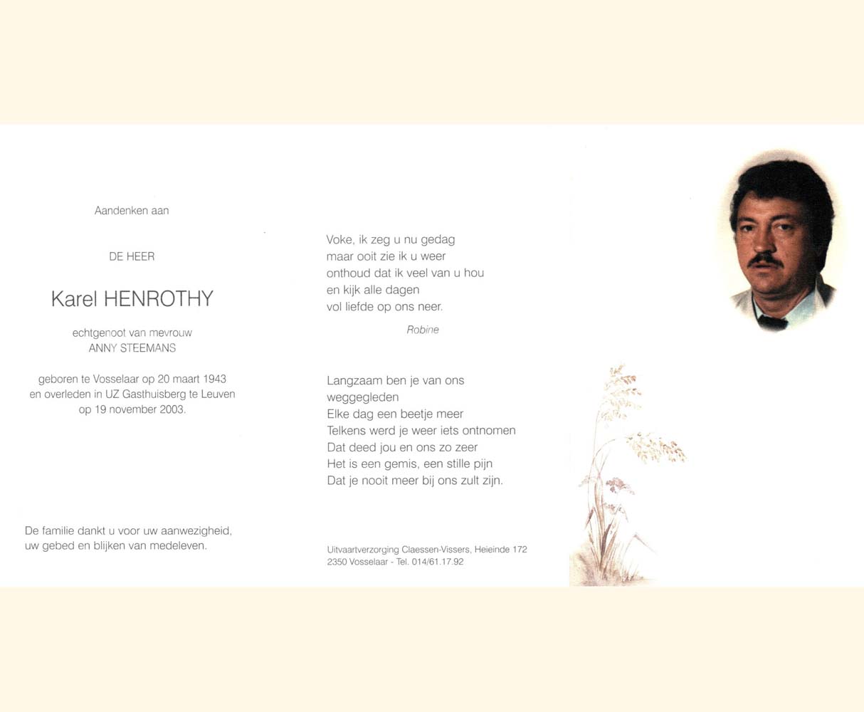 Wij willen met deze website niemand kwetsen of beledigen, het is enkel de bedoeling om genealogische informatie weer te geven.  Daarenboven hechten we veel belang aan ieders privacy.  Heeft u bezwaar tegen de vermelding van een bidprentje van één van uw familieleden die de afgelopen 50 jaar overleden zijn, stuur dan een mailtje naar info@smartsitesolutions.be.