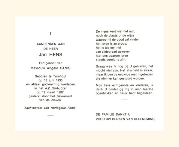 Wij willen met deze website niemand kwetsen of beledigen, het is enkel de bedoeling om genealogische informatie weer te geven.  Daarenboven hechten we veel belang aan ieders privacy.  Heeft u bezwaar tegen de vermelding van een bidprentje van één van uw familieleden die de afgelopen 50 jaar overleden zijn, stuur dan een mailtje naar info@smartsitesolutions.be.