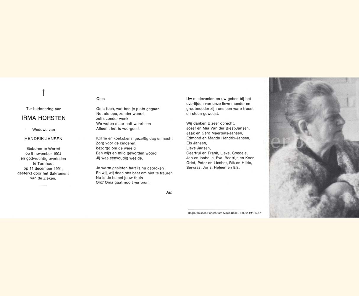 Wij willen met deze website niemand kwetsen of beledigen, het is enkel de bedoeling om genealogische informatie weer te geven.  Daarenboven hechten we veel belang aan ieders privacy.  Heeft u bezwaar tegen de vermelding van een bidprentje van één van uw familieleden die de afgelopen 50 jaar overleden zijn, stuur dan een mailtje naar info@smartsitesolutions.be.