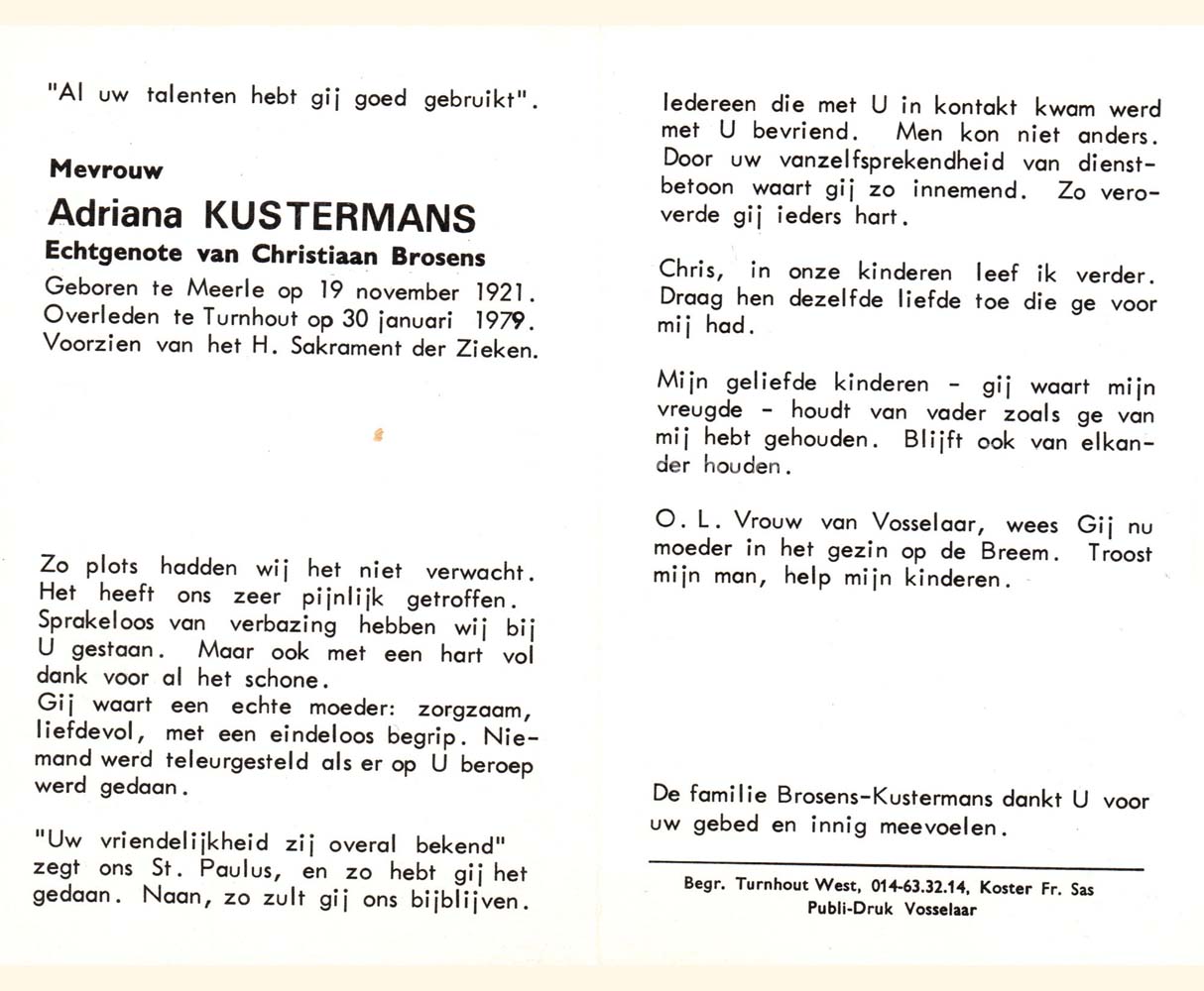 Wij willen met deze website niemand kwetsen of beledigen, het is enkel de bedoeling om genealogische informatie weer te geven.  Daarenboven hechten we veel belang aan ieders privacy.  Heeft u bezwaar tegen de vermelding van een bidprentje van één van uw familieleden die de afgelopen 50 jaar overleden zijn, stuur dan een mailtje naar info@smartsitesolutions.be.