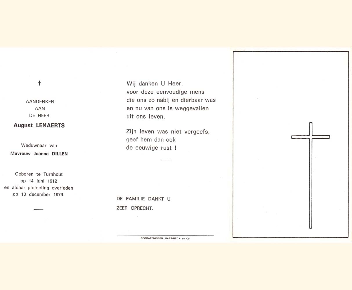 Joannes Antonius Lenaerts stierf anderhalf jaar na zijn enige zoon in zijn woning aan de Grote Markt in Turnhout op 30 december 1855. Zijn vrouw stierf bijna negen jaar later, in 1864.