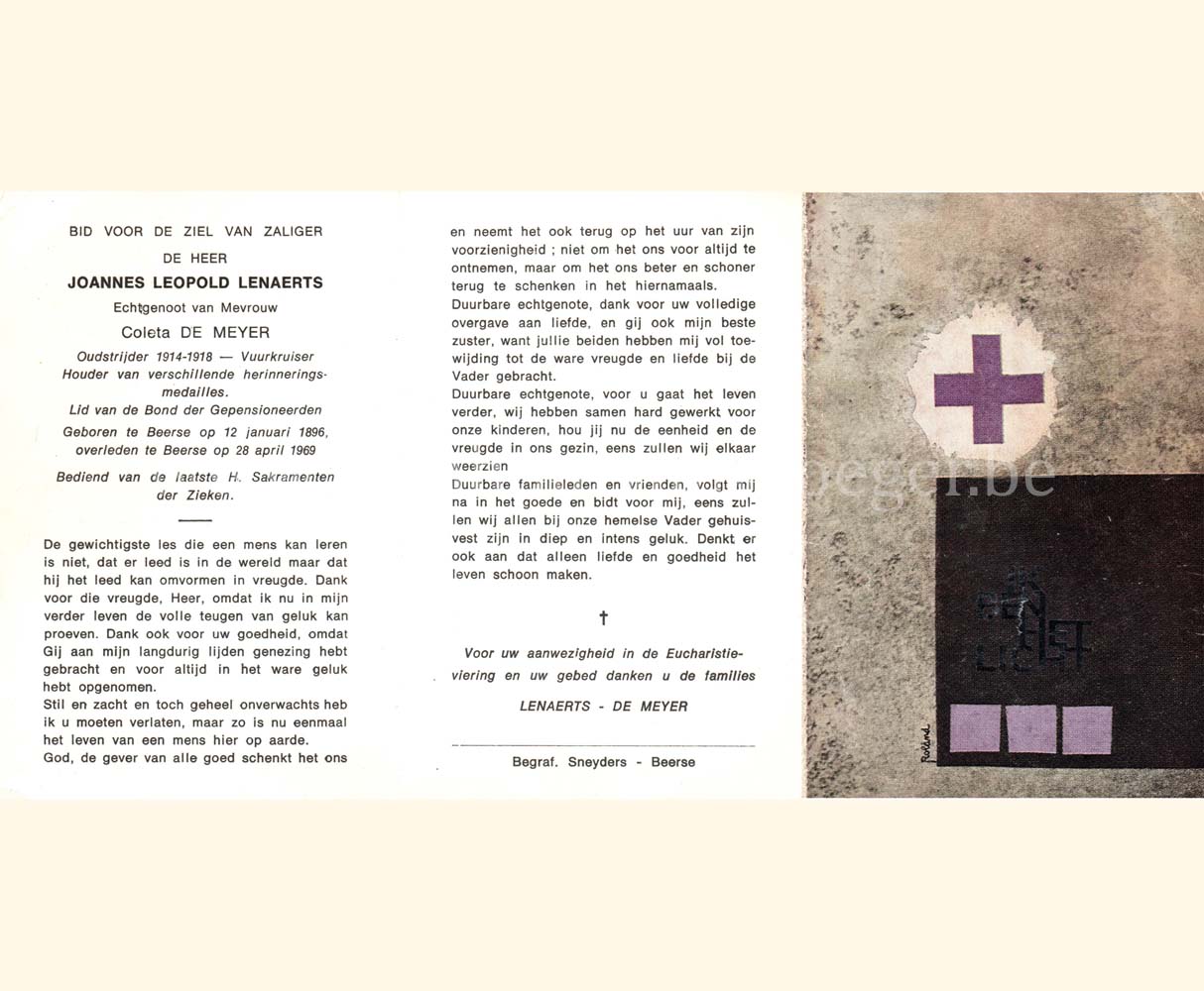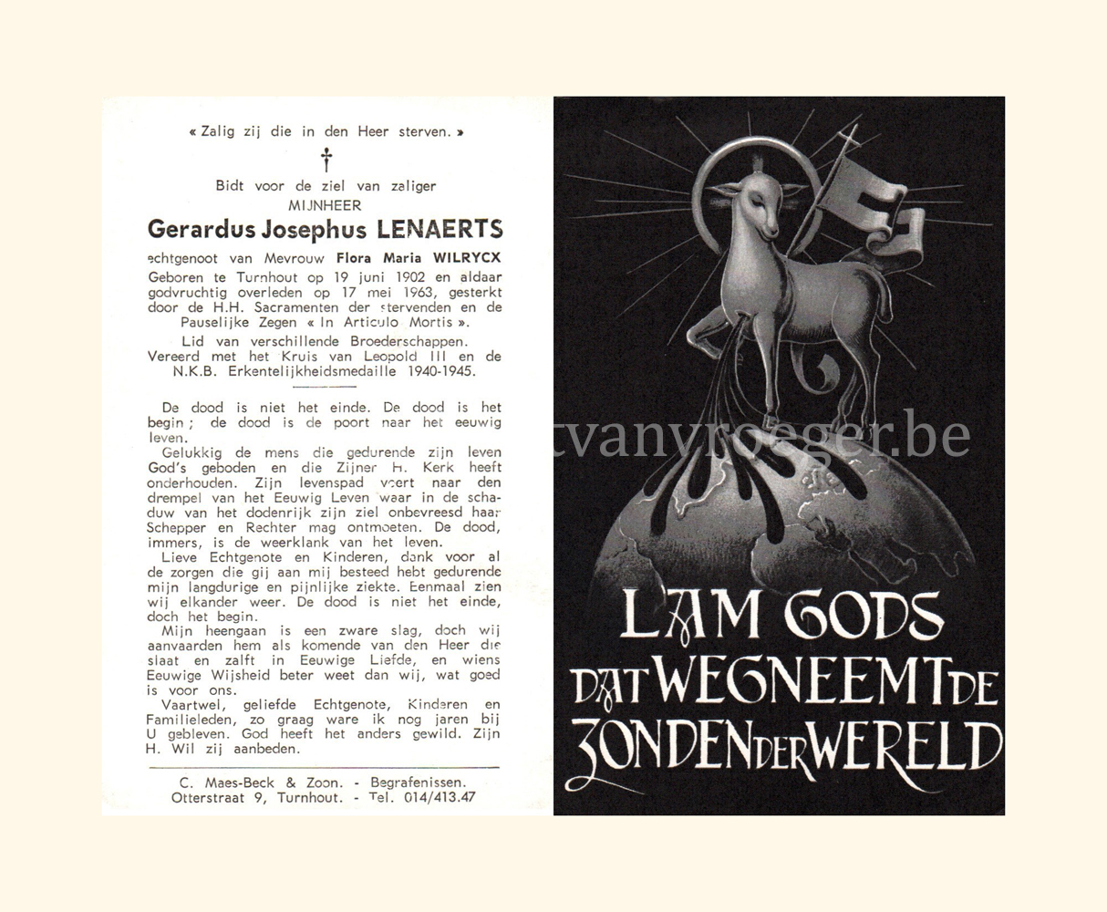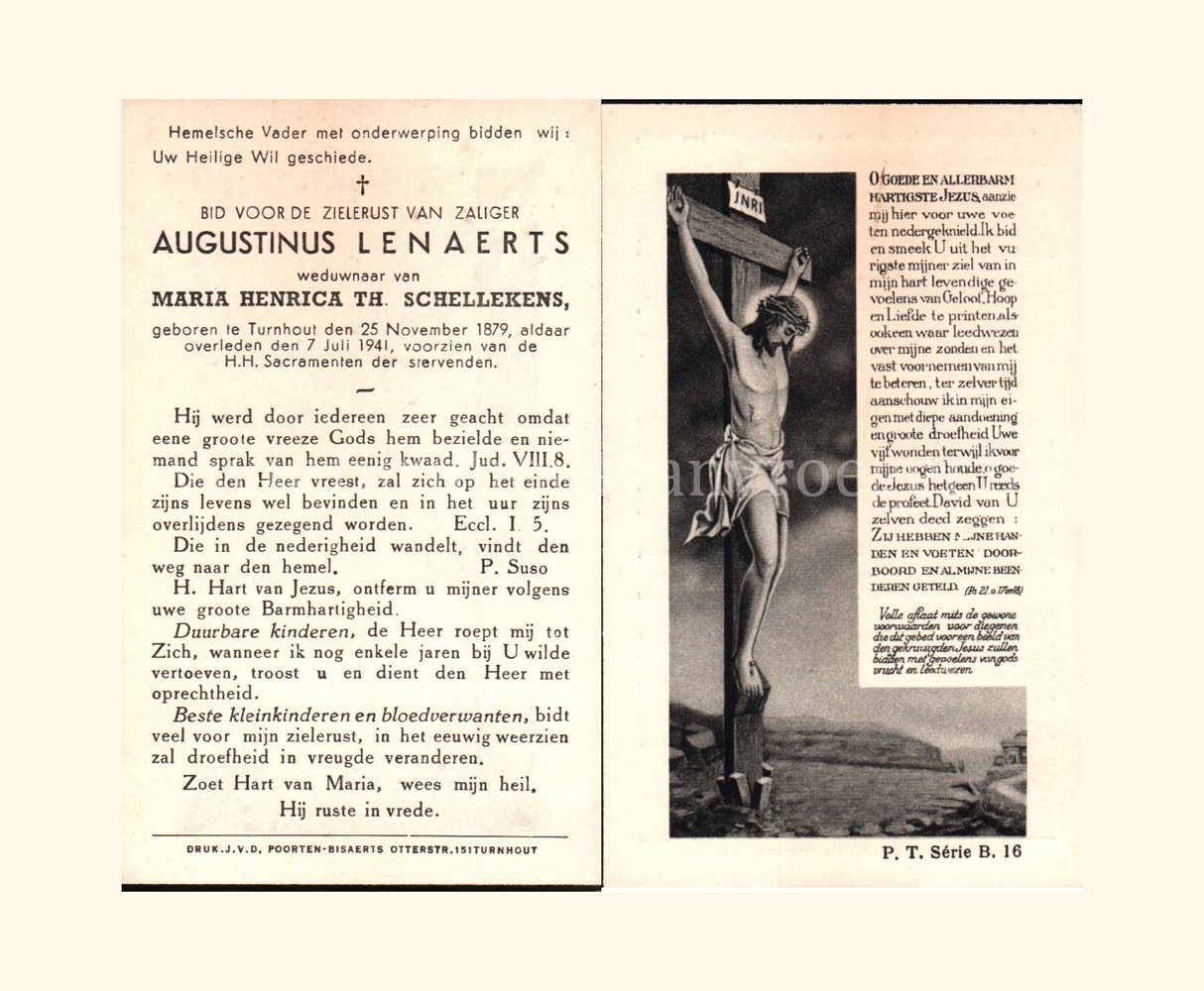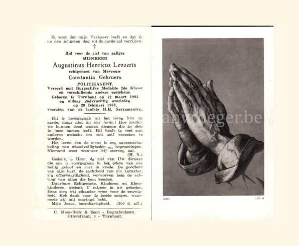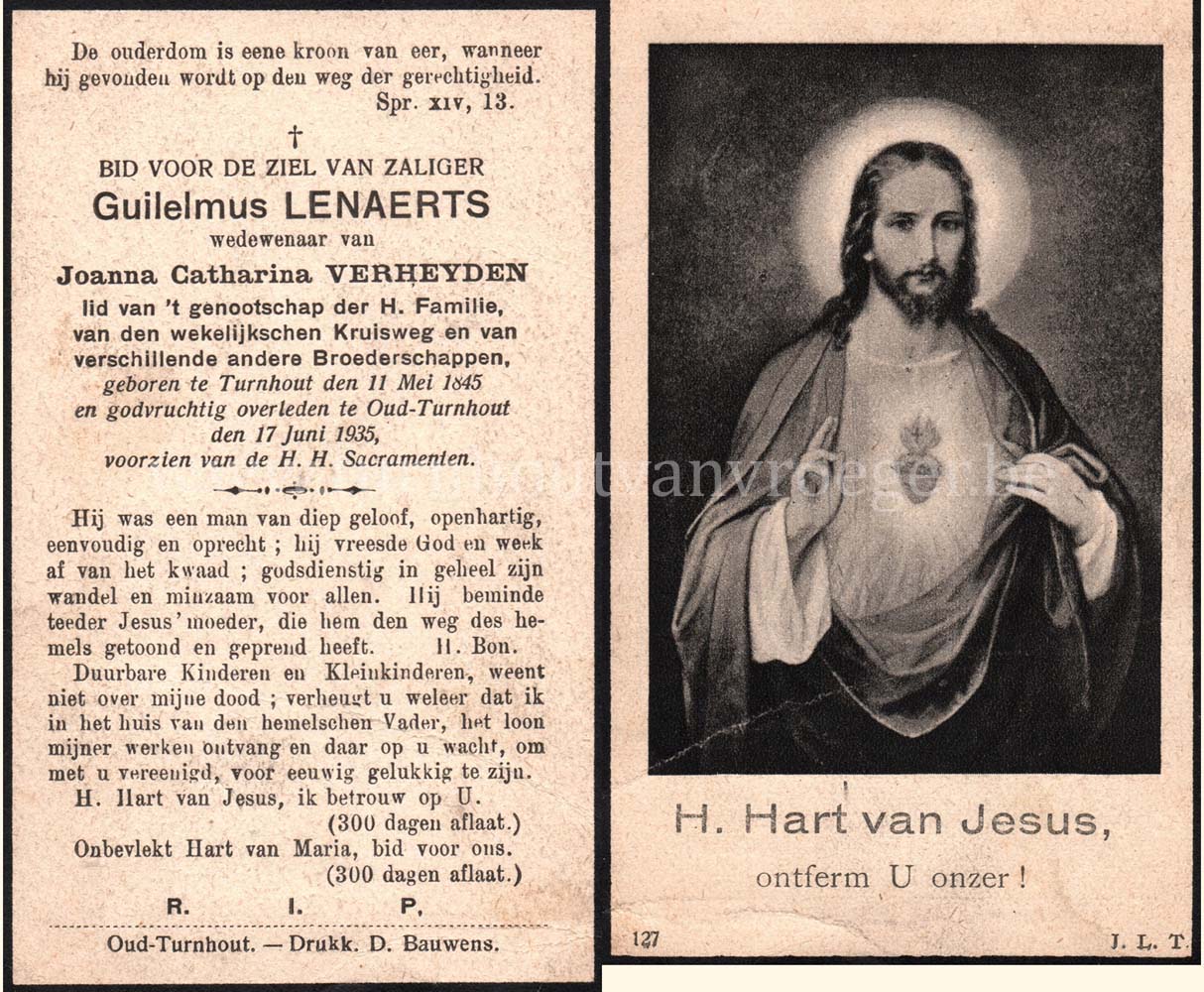 Carolus Lenaerts sterft reeds als hij nog geen 23 jaar oud is en de tekst op zijn bidprentje spreekt boekdelen: “De mensch komt als eene bloem te voorschyn en verdwynt als eene schaduwe” en “Heere, menigvuldige en pynelyke kwellingen hebt gym y laten proeven” en als dat nog niet volstaat: “Door vele kwellingen moeten wy komen in het ryk Gods”