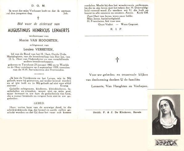 Dit keer niet één maar drie bidprentjes die maar liefst 169 jaar oud zijn, van twee verschillende, toonaangevende Turnhoutse drukkerijen: één bidprentje gedrukt bij de Weduwe Delhuvenne in Turnhout en een Nederlandstalig en een Franstalig bidprentje gedrukt bij Brepols en Dierckx Zoon