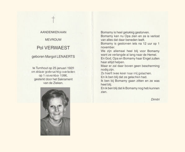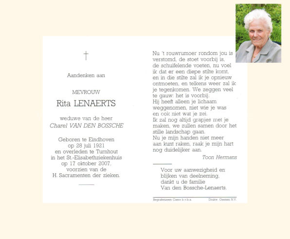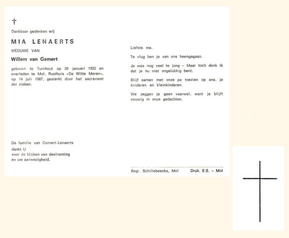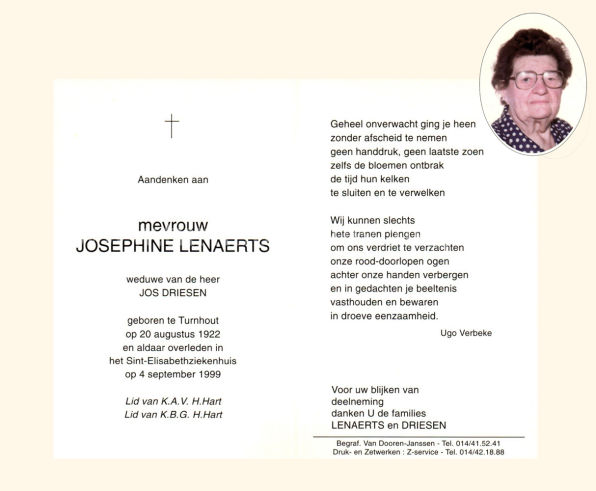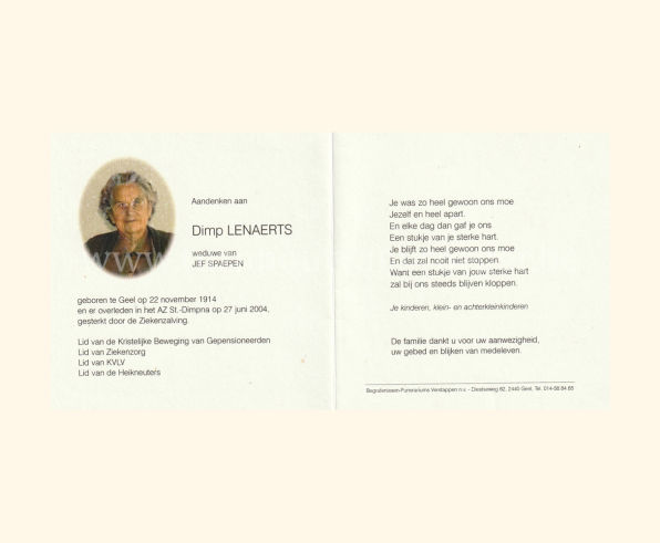 Wij willen met deze website niemand kwetsen of beledigen, het is enkel de bedoeling om genealogische informatie weer te geven. Daarenboven hechten we veel belang aan ieders privacy. Heeft u bezwaar tegen de vermelding van een bidprentje van één van uw familieleden die de afgelopen 50 jaar overleden zijn, stuur dan een mailtje naar info@smartsitesolutions.be.