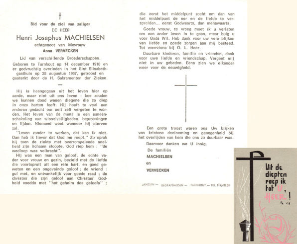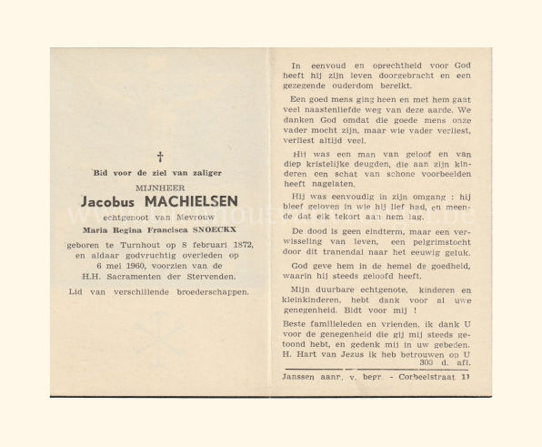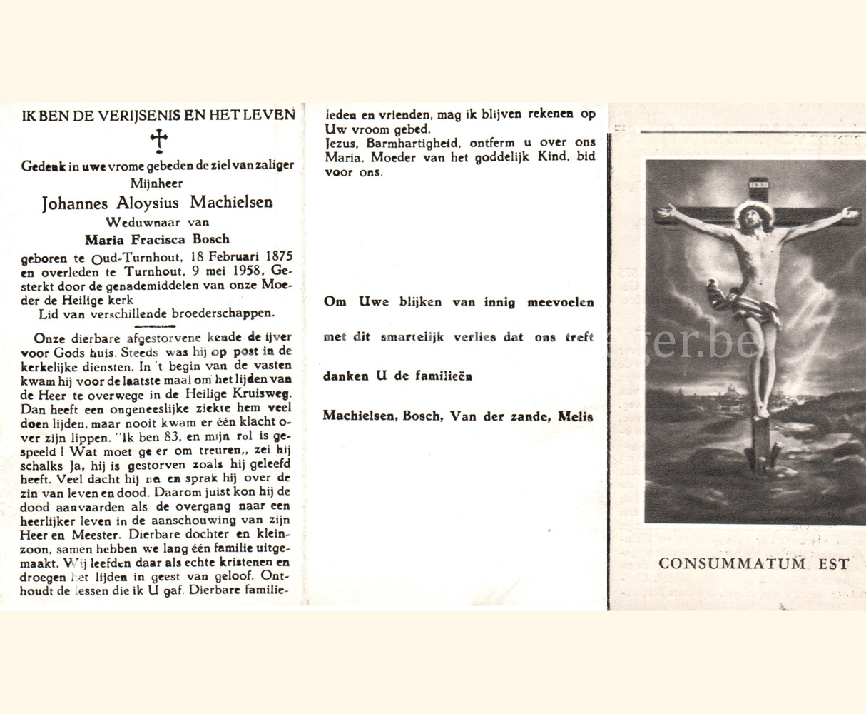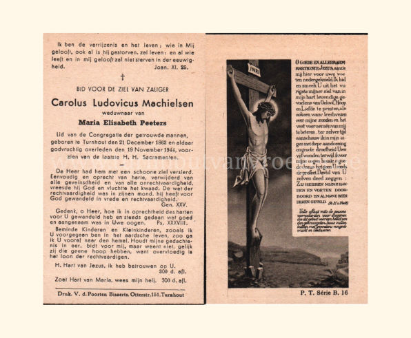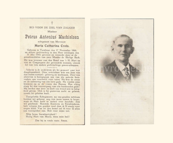 Petrus werd tabakbewerker en trouwde met Maria Catharina Crols (° Turnhout, 04/06/1868). Ze kregen vier kinderen die na hun huwelijk ook allemaal in Turnhout bleven wonen. Zijn bidprentje werd voorzien van een mooie foto en dat is voor mij bijzonder in die zin dat nu iedereen weet hoe de man eruit gezien heeft. Een gewone man die – zoals het gangbaar was in die tijd lid was van vele godvruchtige genootschappen. Hij was “ieveraar” van den Bond van ’t Heilig Hart en van de Congregatie der getrouwde mannen.