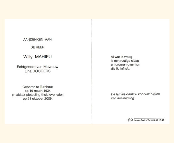 Wij willen met deze website niemand kwetsen of beledigen, het is enkel de bedoeling om genealogische informatie weer te geven.  Daarenboven hechten we veel belang aan ieders privacy.  Heeft u bezwaar tegen de vermelding van een bidprentje van één van uw familieleden die de afgelopen 50 jaar overleden zijn, stuur dan een mailtje naar info@smartsitesolutions.be.
