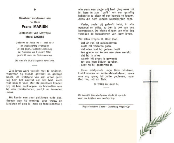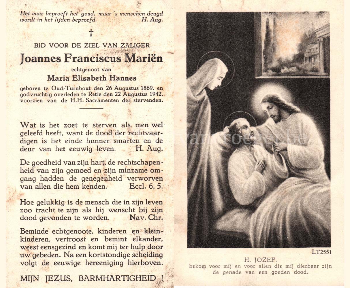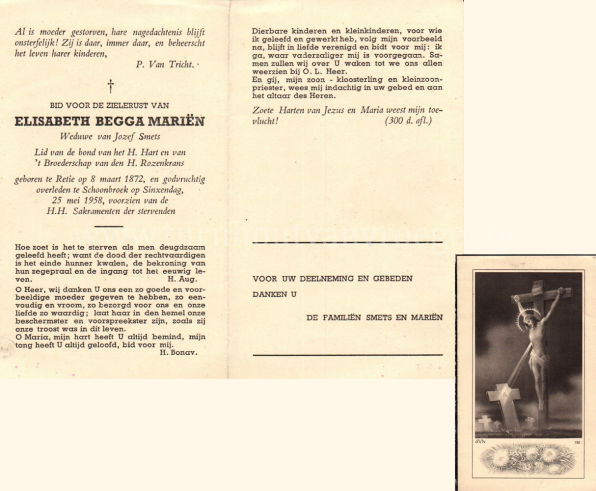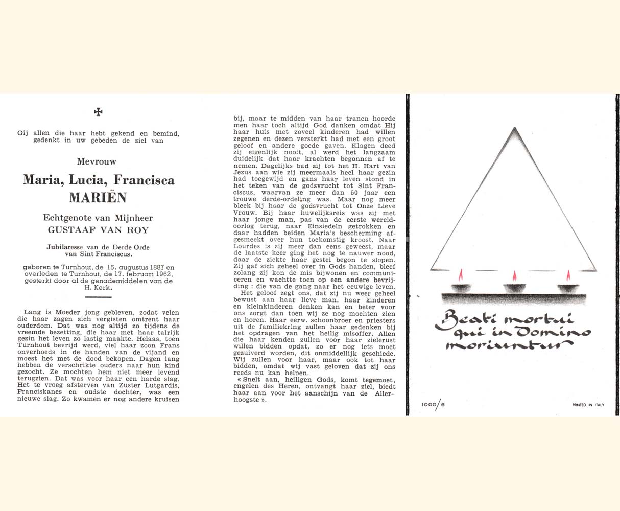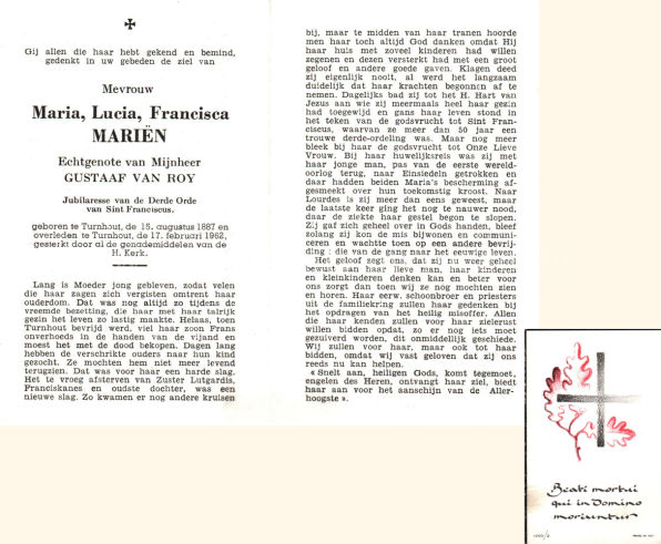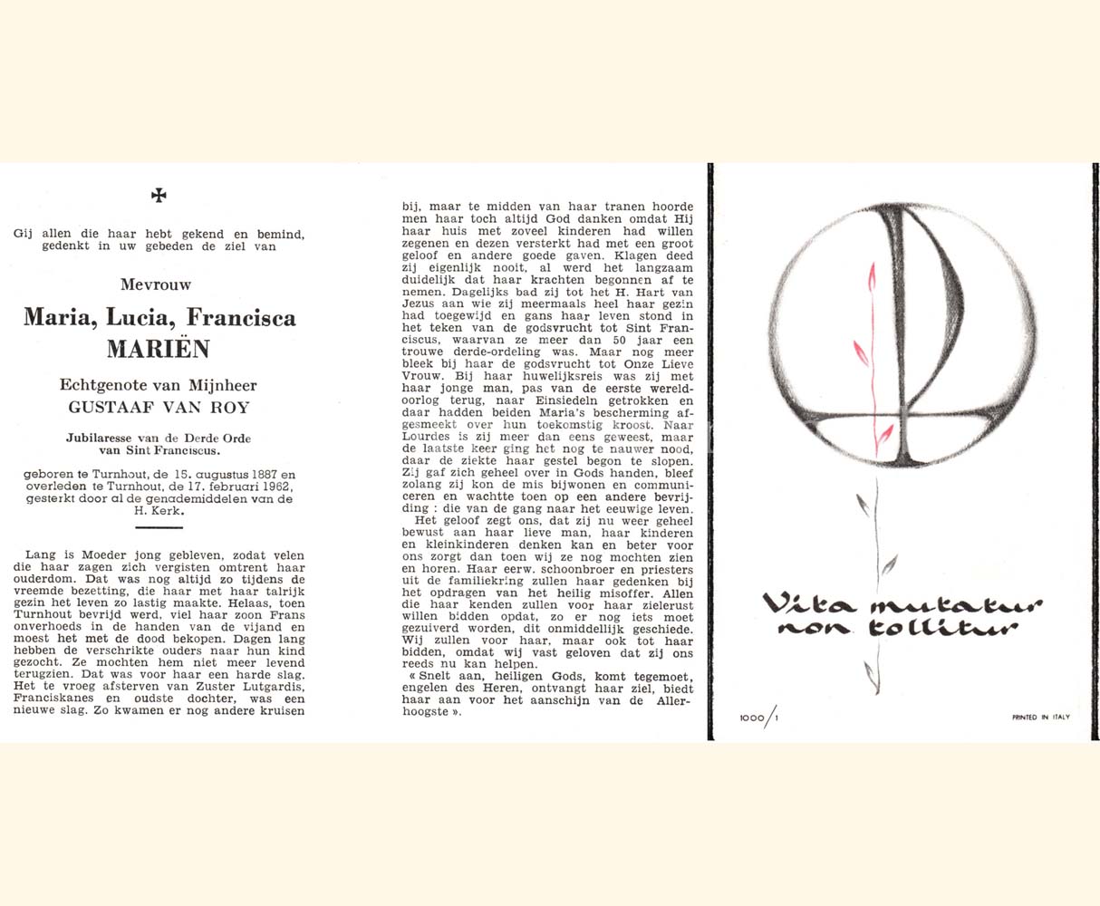Wij willen met deze website niemand kwetsen of beledigen, het is enkel de bedoeling om genealogische informatie weer te geven.  Daarenboven hechten we veel belang aan ieders privacy.  Heeft u bezwaar tegen de vermelding van een bidprentje van één van uw familieleden die de afgelopen 50 jaar overleden zijn, stuur dan een mailtje naar info@smartsitesolutions.be.