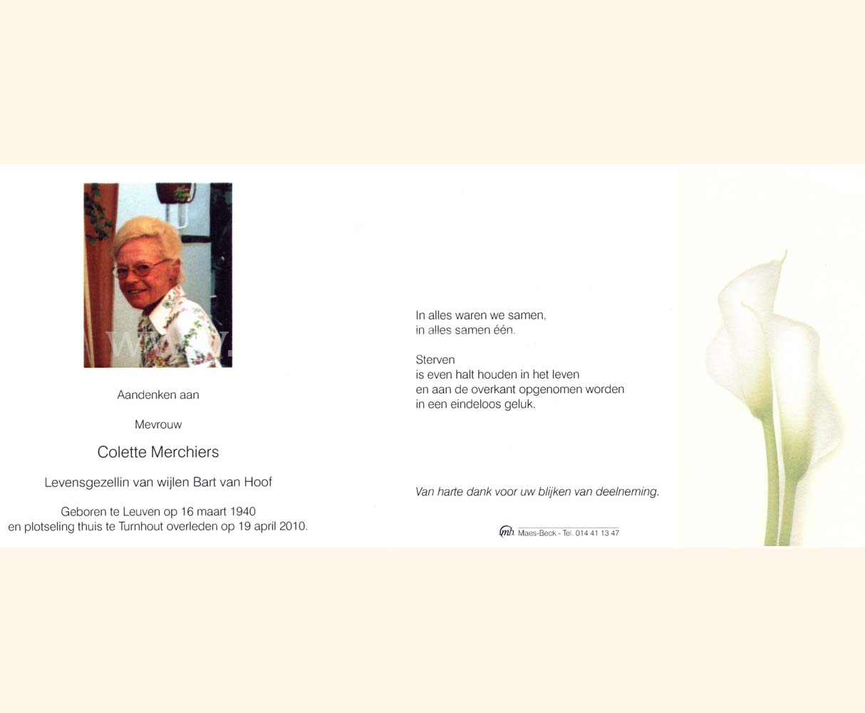 Wij willen met deze website niemand kwetsen of beledigen, het is enkel de bedoeling om genealogische informatie weer te geven.  Daarenboven hechten we veel belang aan ieders privacy.  Heeft u bezwaar tegen de vermelding van een bidprentje van één van uw familieleden die de afgelopen 50 jaar overleden zijn, stuur dan een mailtje naar info@smartsitesolutions.be.