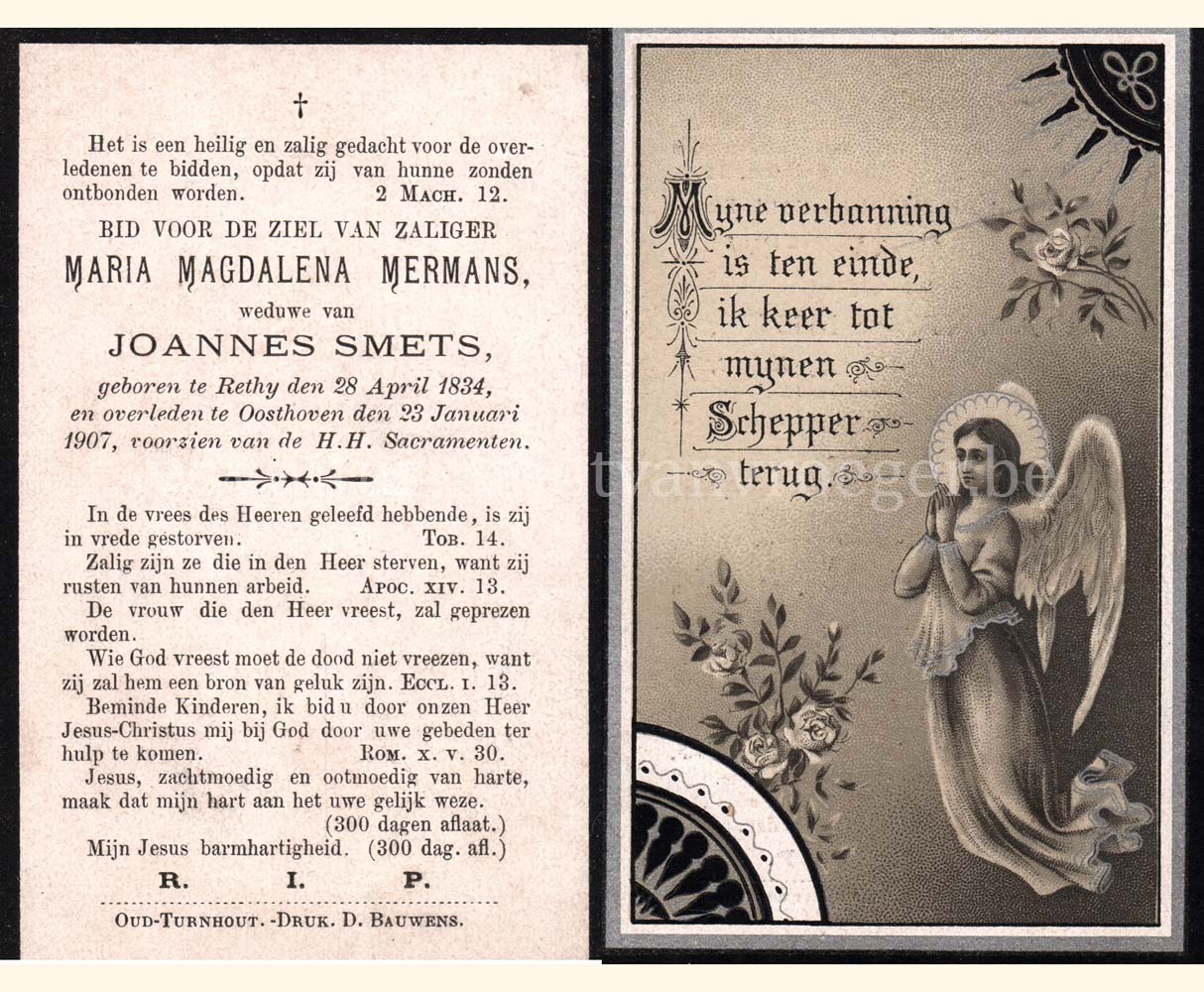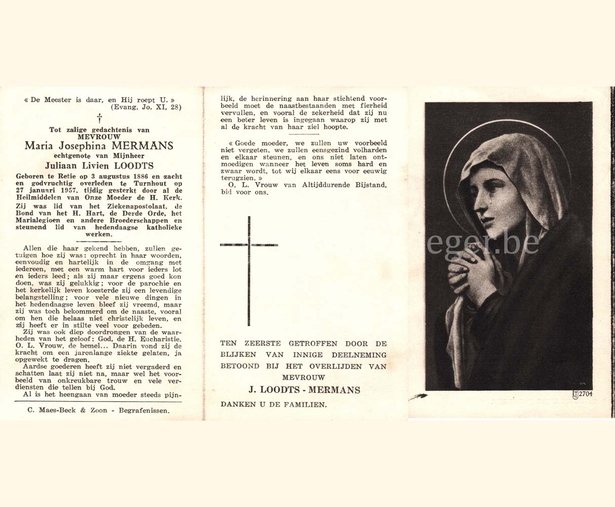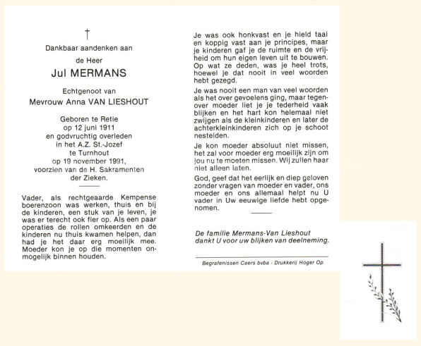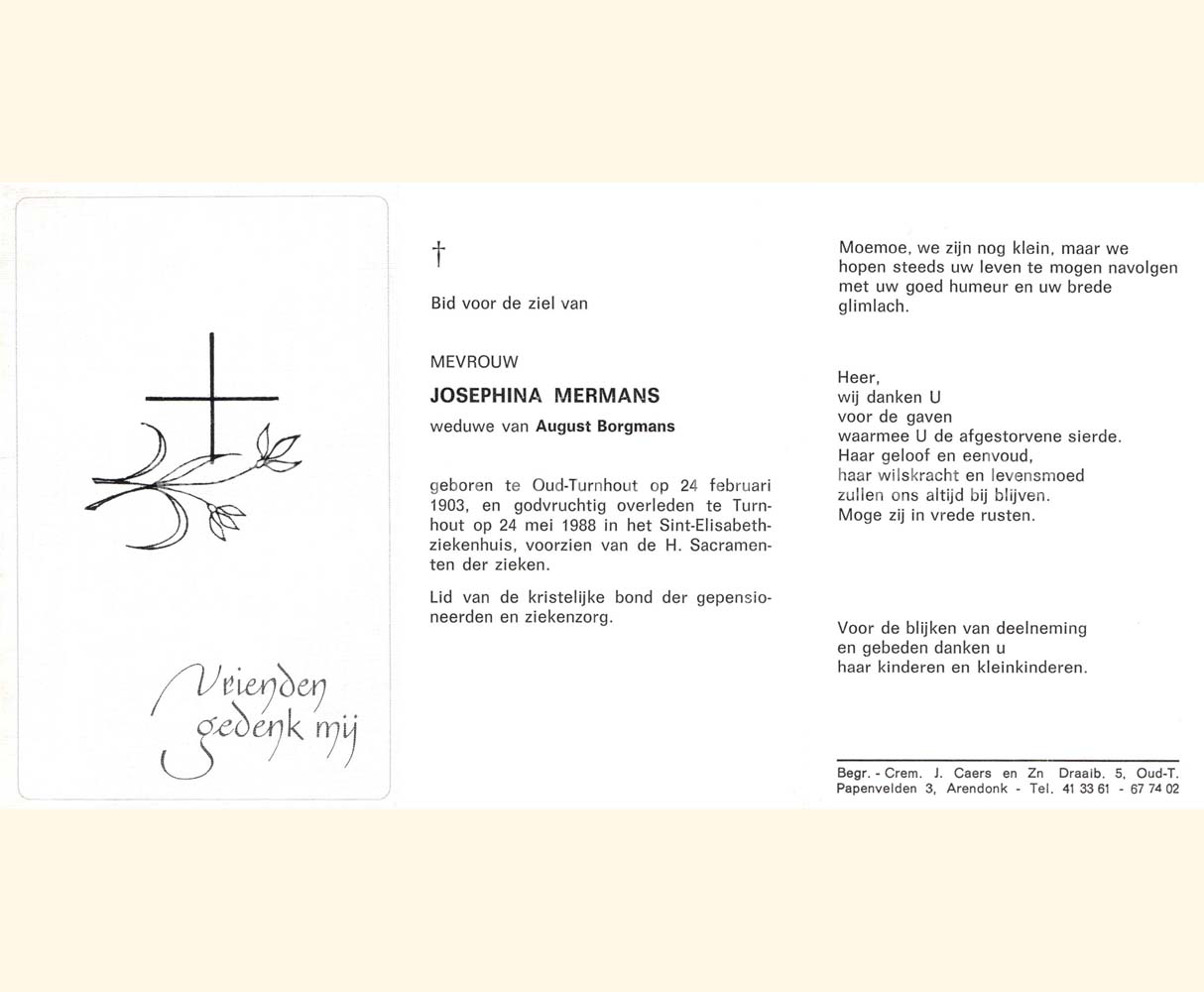 Wij willen met deze website niemand kwetsen of beledigen, het is enkel de bedoeling om genealogische informatie weer te geven.  Daarenboven hechten we veel belang aan ieders privacy.  Heeft u bezwaar tegen de vermelding van een bidprentje van één van uw familieleden die de afgelopen 50 jaar overleden zijn, stuur dan een mailtje naar info@smartsitesolutions.be.