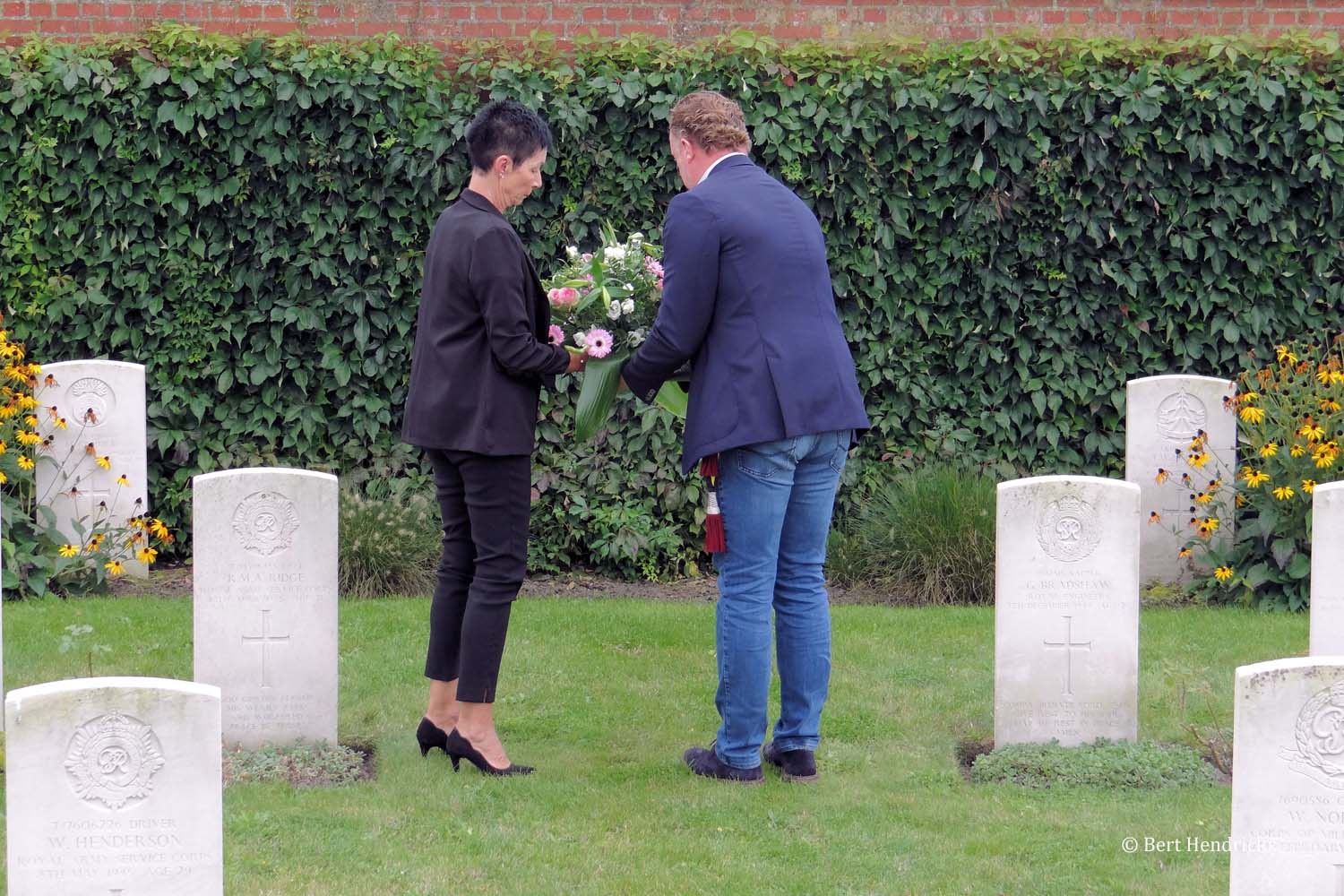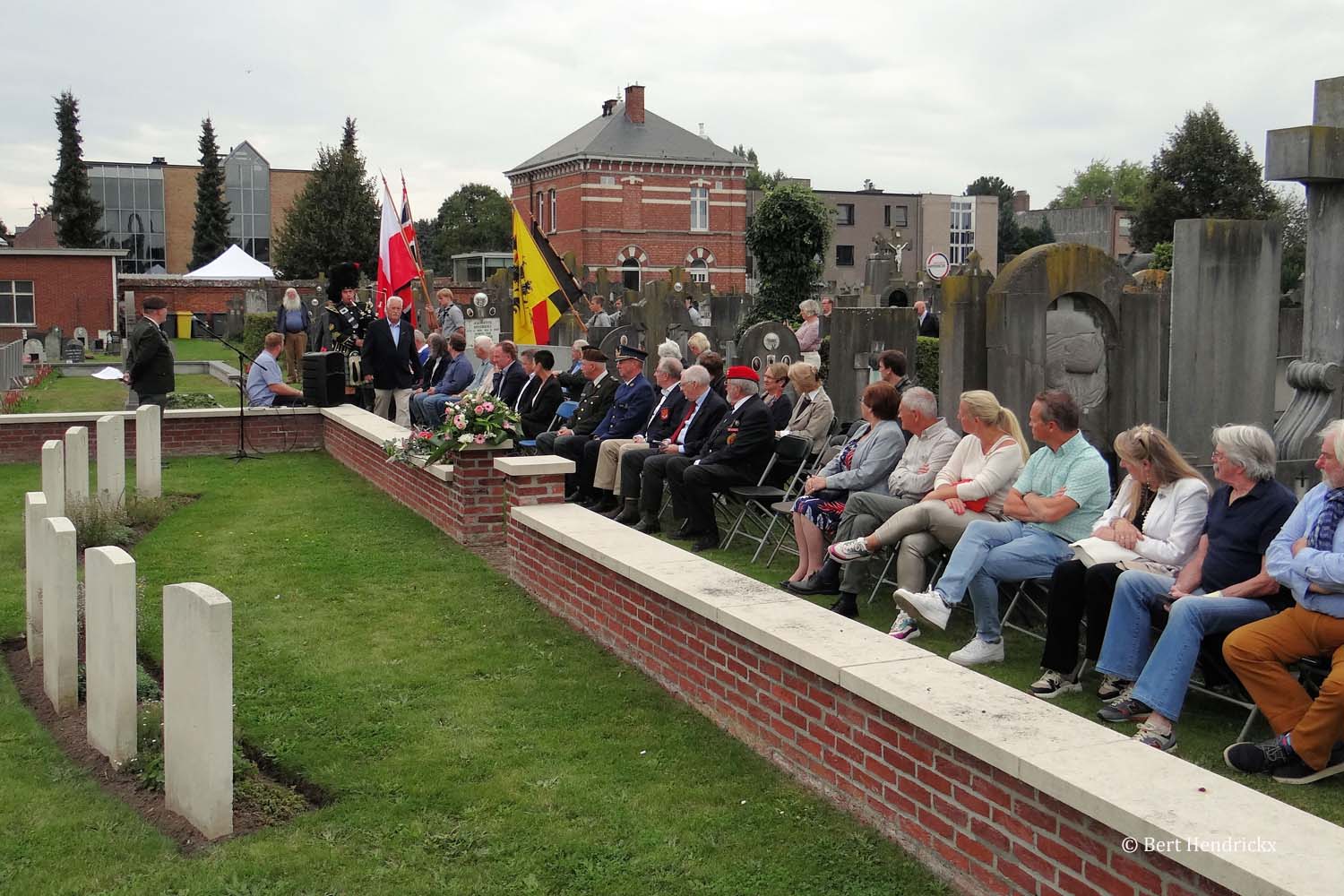 Er vonden van de verschillende delegaties bloemneerleggingen plaats en Rob Cornelissen legde bloemen neer in het ereperk van de burgerslachtoffers. Na een prachtig uitgevoerde versie van de Last Post door de trompetter Paul Potters en het spelen van de nationale hymnen, verplaatsten de aanwezigen zich onder begeleiding van doedelzakmuziek naar het ereperk van de verzetslieden en militairen waar een korte herdenking met bloemenneerlegging en de Last Post volgden.