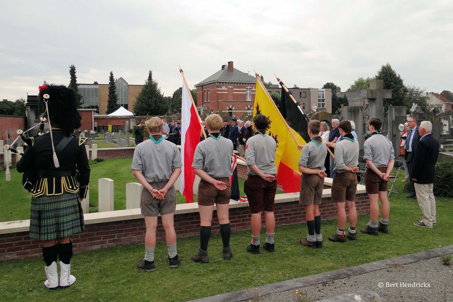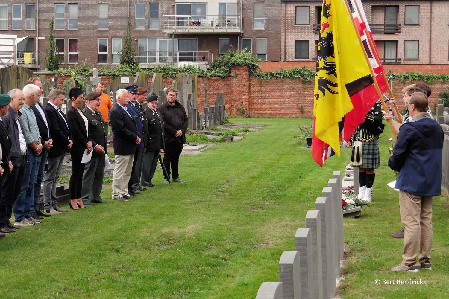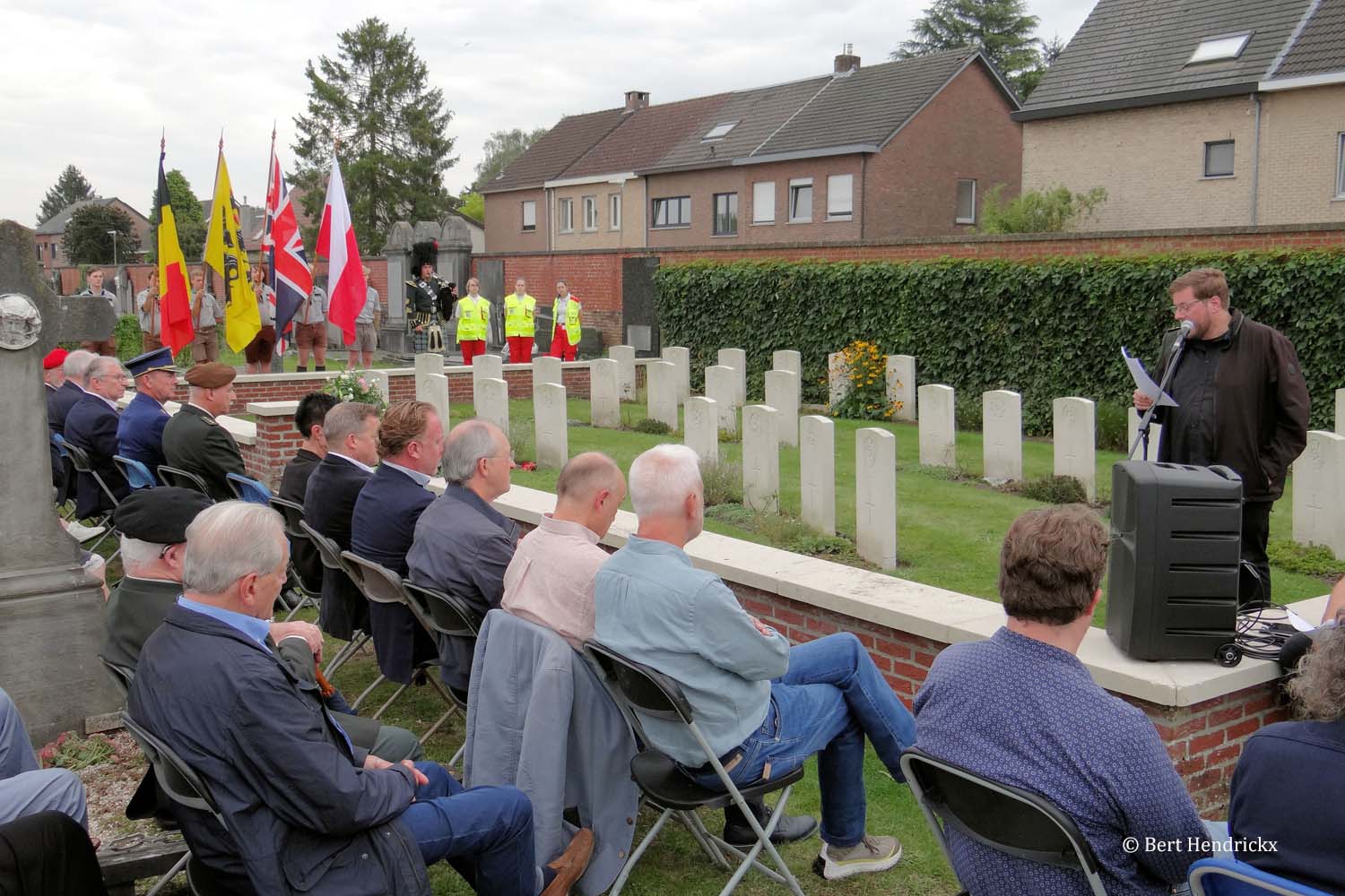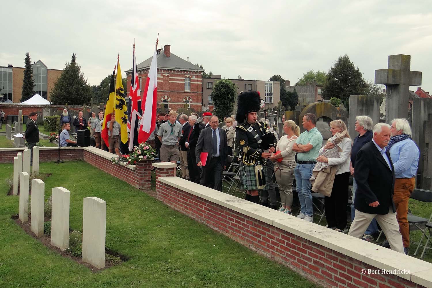 Onder begeleiding van prachtige doedelzakmuziek gebracht door Toine Baert, kwamen de vaandeldragers toe aan de ereperken van de Commonwealth en de Burgerslachtoffers. Na de verwelkoming door Ere Luitenant Kolonel Nuyens sprak schepen Stijn Adriaensens de aanwezigen toe, hij kaartte vooral de huidige situatie in de wereld aan en concludeerde dat men weinig lessen getrokken had uit de oorlogsgebeurtenissen van meer dan 80 jaar geleden. Na schepen Adriaensens hield ik een overzichtstoespraak van de gebeurtenissen tijdens WO II in Turnhout, met speciale aandacht voor de burgerslachtoffers, de weerstanders en de Turnhoutse militairen. Deze toespraak kan u hier herlezen.
