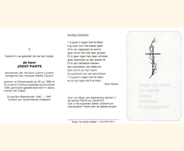 Wij willen met deze website niemand kwetsen of beledigen, het is enkel de bedoeling om genealogische informatie weer te geven.  Daarenboven hechten we veel belang aan ieders privacy.  Heeft u bezwaar tegen de vermelding van een bidprentje van één van uw familieleden die de afgelopen 50 jaar overleden zijn, stuur dan een mailtje naar info@smartsitesolutions.be.