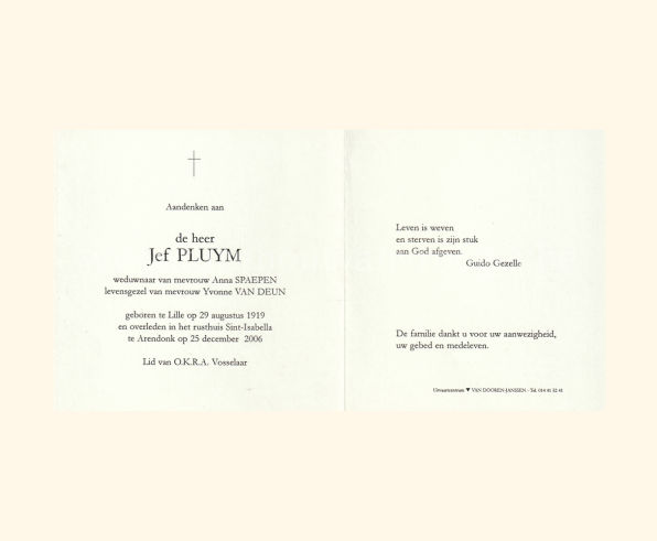Wij willen met deze website niemand kwetsen of beledigen, het is enkel de bedoeling om genealogische informatie weer te geven. Daarenboven hechten we veel belang aan ieders privacy. Heeft u bezwaar tegen de vermelding van een bidprentje van één van uw familieleden die de afgelopen 50 jaar overleden zijn, stuur dan een mailtje naar info@smartsitesolutions.be.