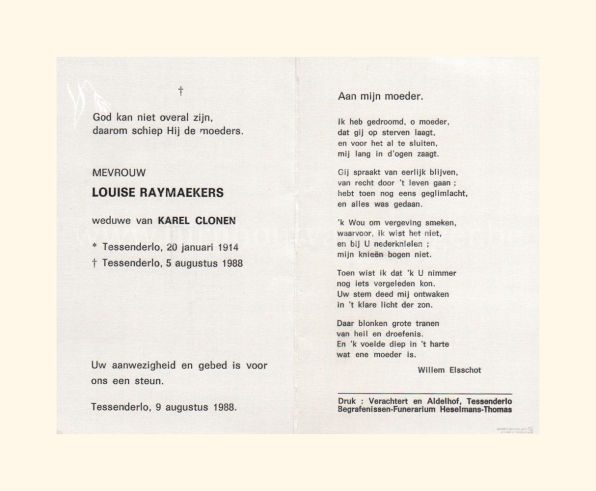 Wij willen met deze website niemand kwetsen of beledigen, het is enkel de bedoeling om genealogische informatie weer te geven.  Daarenboven hechten we veel belang aan ieders privacy.  Heeft u bezwaar tegen de vermelding van een bidprentje van één van uw familieleden die de afgelopen 50 jaar overleden zijn, stuur dan een mailtje naar info@smartsitesolutions.be.