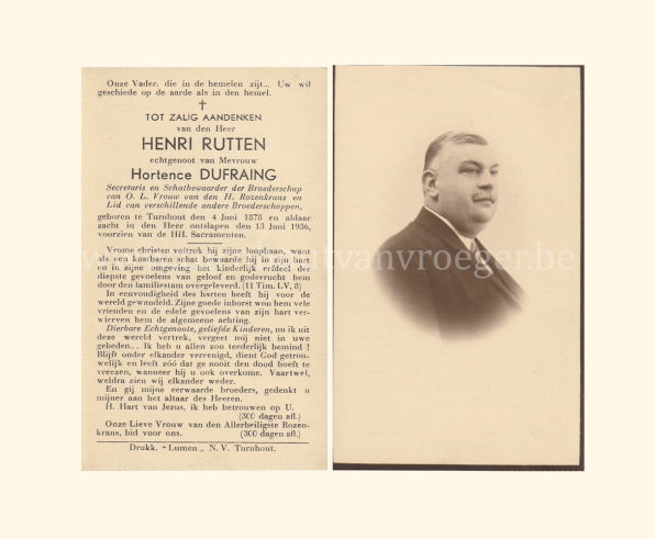 Pater Rutten bleek een aanzienlijk archief bijgehouden te hebben dat volledig naar zijn thuisstad Weert is teruggegaan. In dat archief zaten ook heel wat bidprentjes van Turnhoutse gesneuvelden uit de Eerste Wereldoorlog die nu meer dan 100 jaar na het overlijden van Pater Rutten terug in Turnhout zijn om door mij bewaard te worden.
