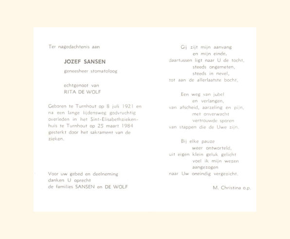 Wij willen met deze website niemand kwetsen of beledigen, het is enkel de bedoeling om genealogische informatie weer te geven.  Daarenboven hechten we veel belang aan ieders privacy.  Heeft u bezwaar tegen de vermelding van een bidprentje van één van uw familieleden die de afgelopen 50 jaar overleden zijn, stuur dan een mailtje naar info@smartsitesolutions.be.