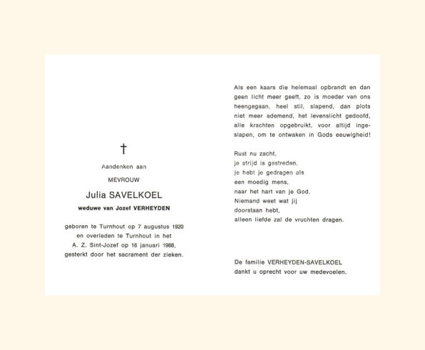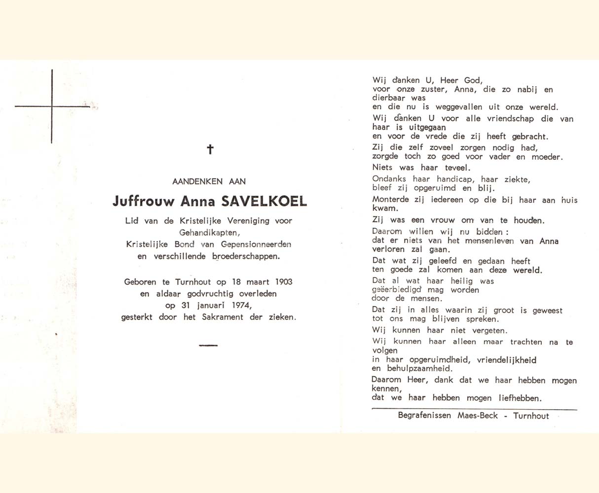 Wij willen met deze website niemand kwetsen of beledigen, het is enkel de bedoeling om genealogische informatie weer te geven.  Daarenboven hechten we veel belang aan ieders privacy.  Heeft u bezwaar tegen de vermelding van een bidprentje van één van uw familieleden die de afgelopen 50 jaar overleden zijn, stuur dan een mailtje naar info@smartsitesolutions.be.