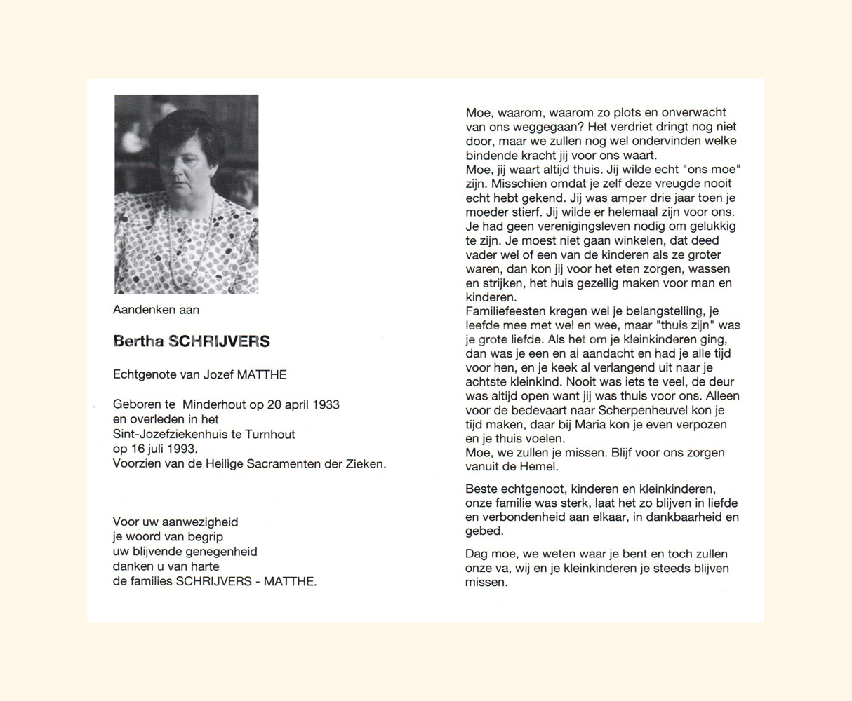 Wij willen met deze website niemand kwetsen of beledigen, het is enkel de bedoeling om genealogische informatie weer te geven.  Daarenboven hechten we veel belang aan ieders privacy.  Heeft u bezwaar tegen de vermelding van een bidprentje van één van uw familieleden die de afgelopen 50 jaar overleden zijn, stuur dan een mailtje naar info@smartsitesolutions.be.