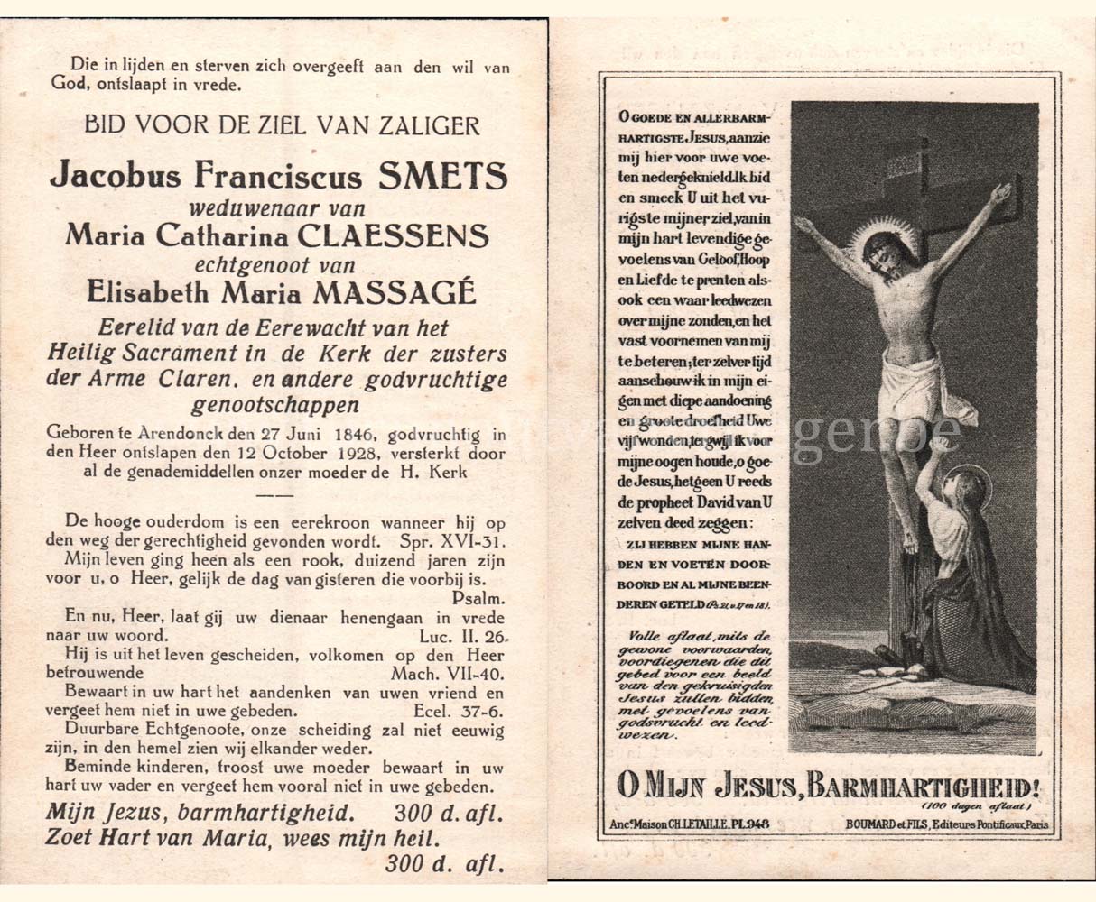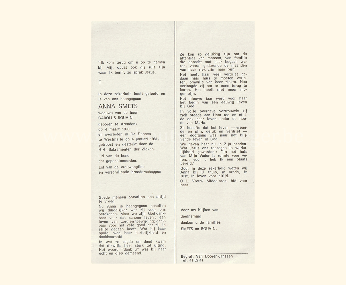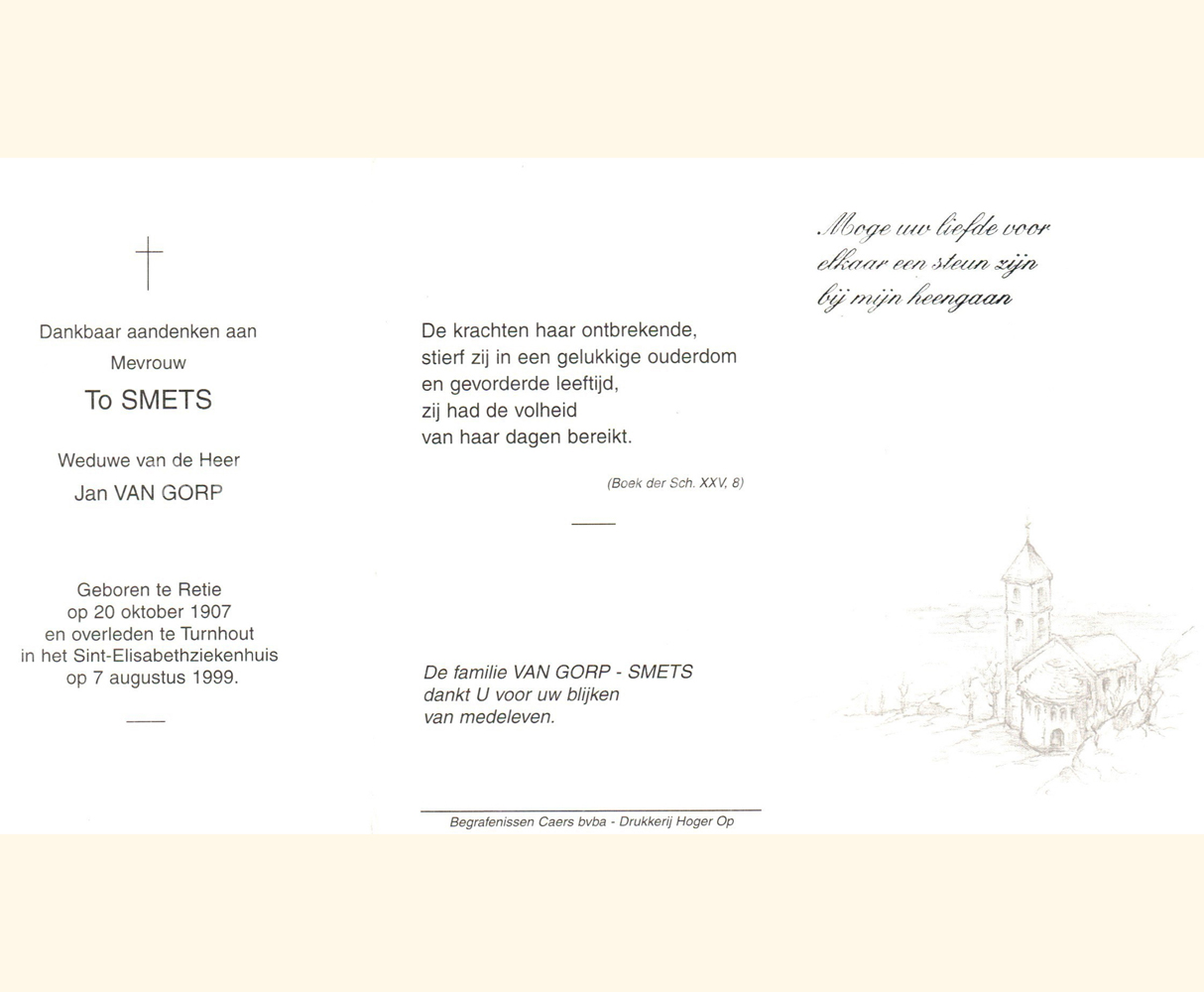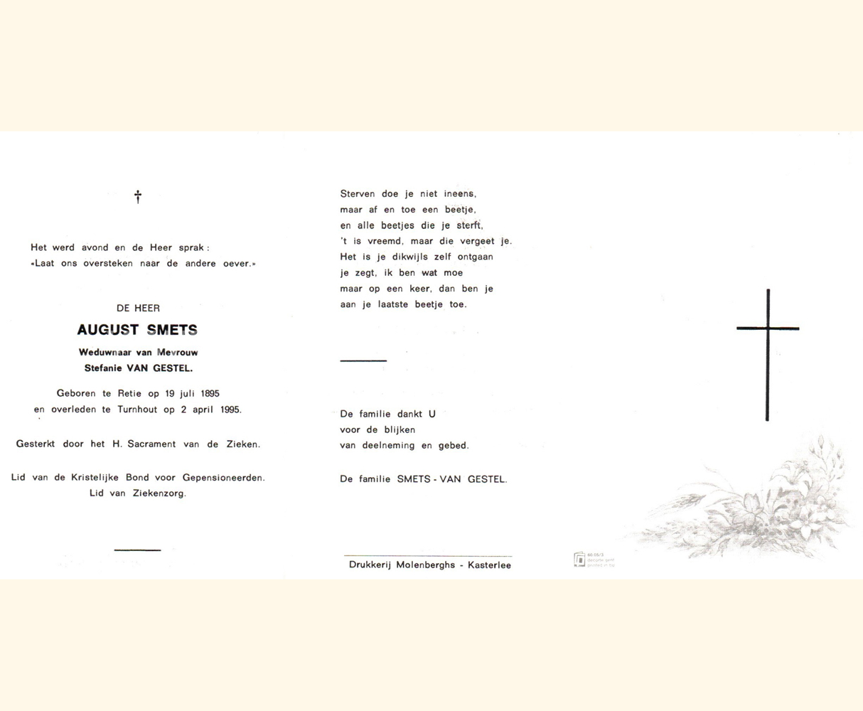 Wij willen met deze website niemand kwetsen of beledigen, het is enkel de bedoeling om genealogische informatie weer te geven. Daarenboven hechten we veel belang aan ieders privacy. Heeft u bezwaar tegen de vermelding van een bidprentje van één van uw familieleden die de afgelopen 50 jaar overleden zijn, stuur dan een mailtje naar info@smartsitesolutions.be.
