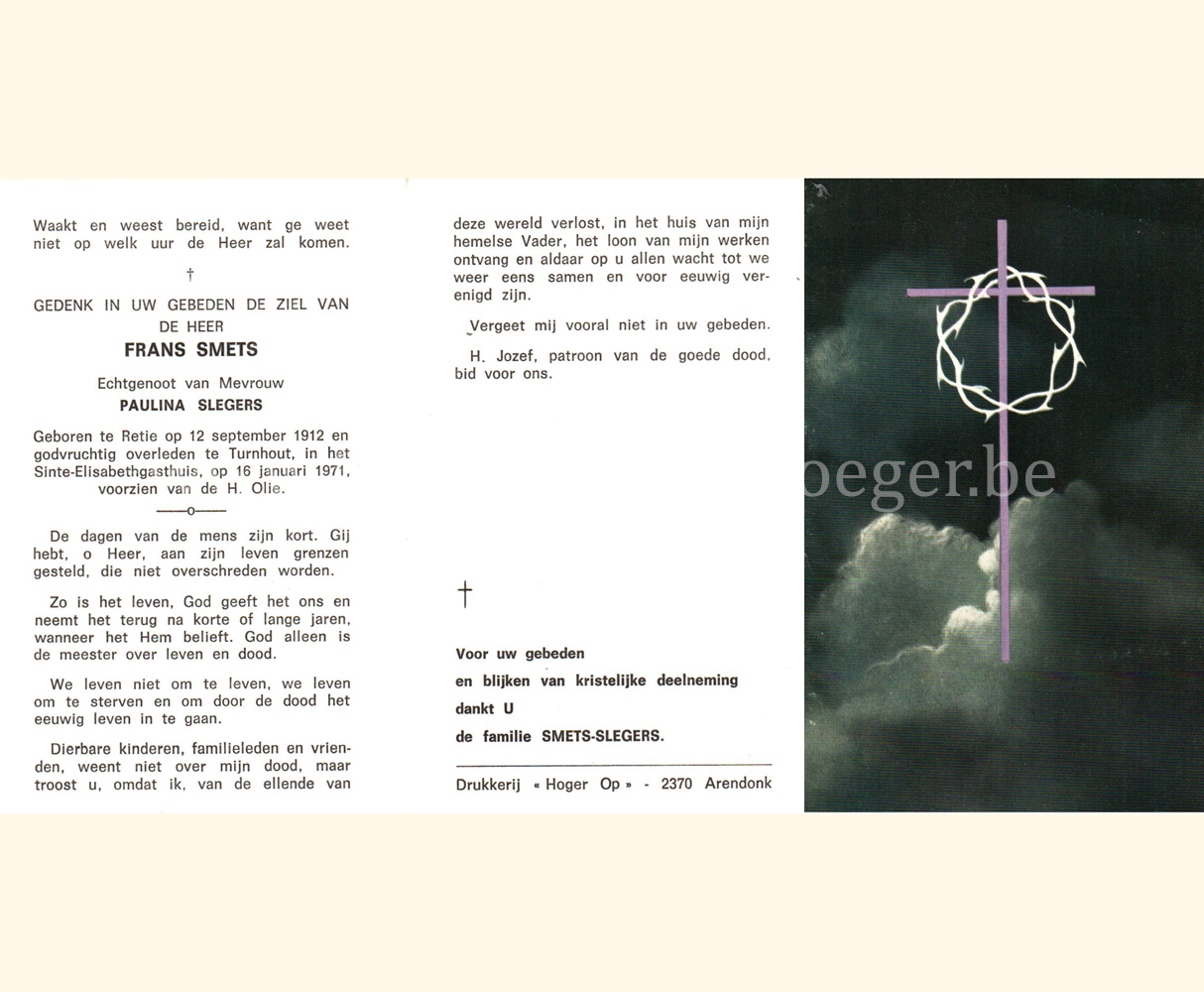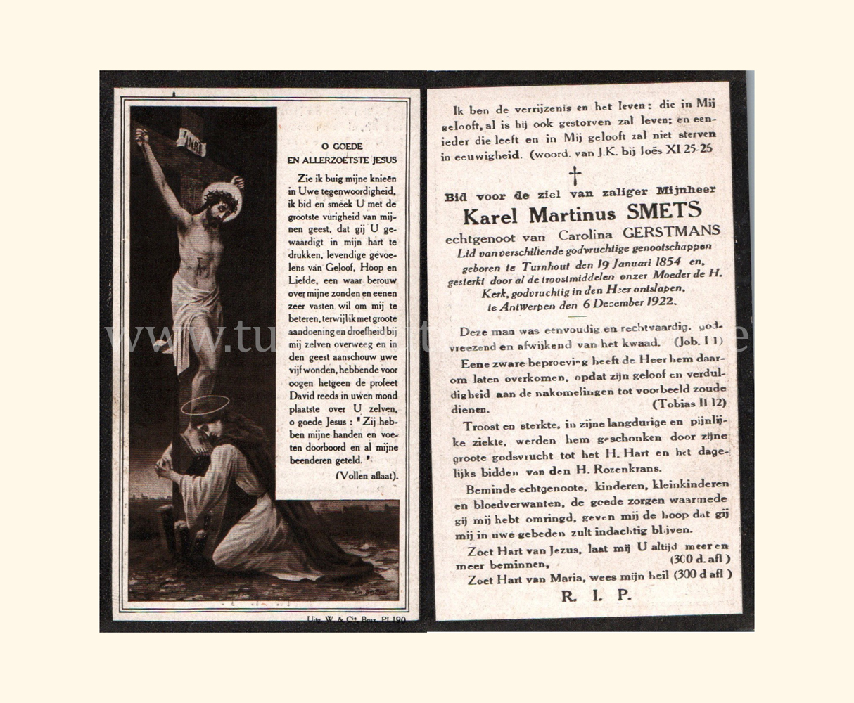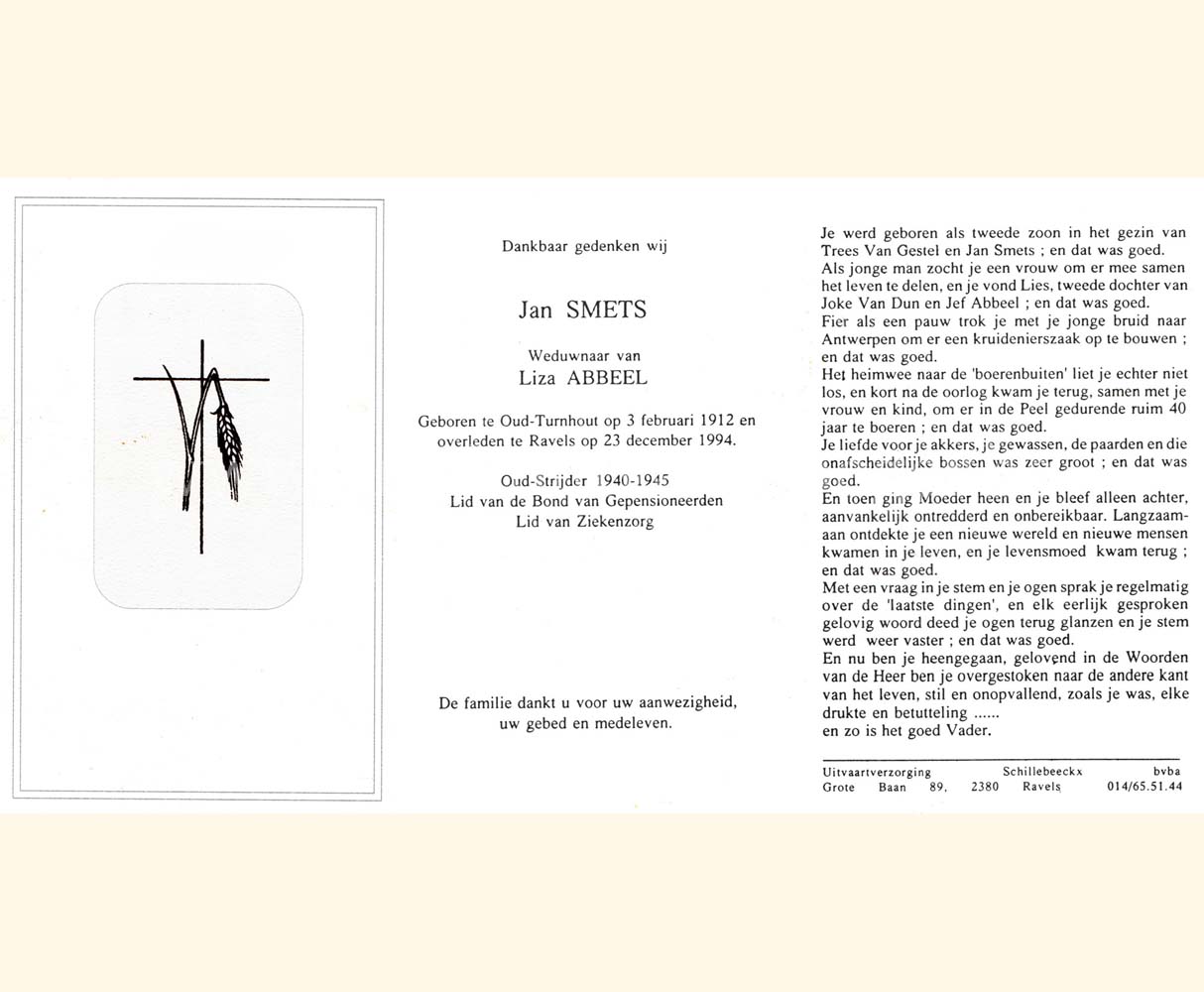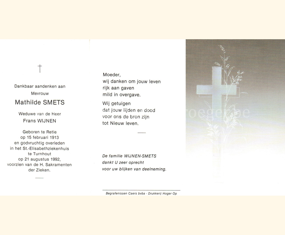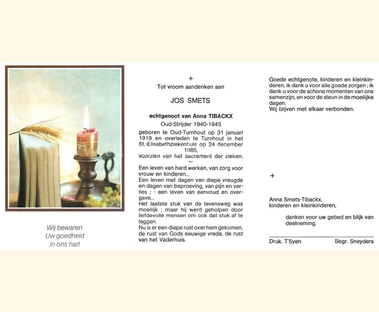 Wij willen met deze website niemand kwetsen of beledigen, het is enkel de bedoeling om genealogische informatie weer te geven. Daarenboven hechten we veel belang aan ieders privacy. Heeft u bezwaar tegen de vermelding van een bidprentje van één van uw familieleden die de afgelopen 50 jaar overleden zijn, stuur dan een mailtje naar info@smartsitesolutions.be.