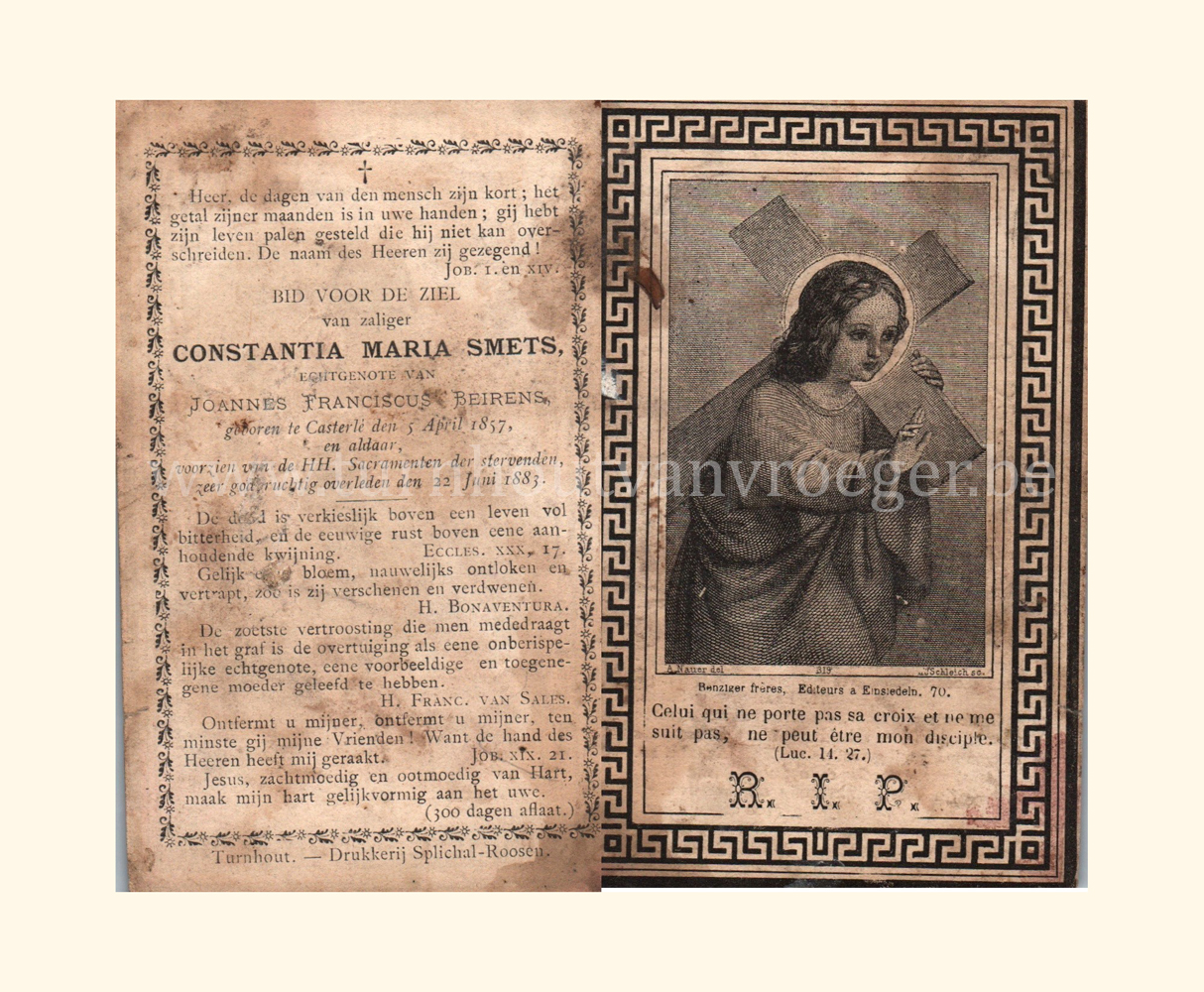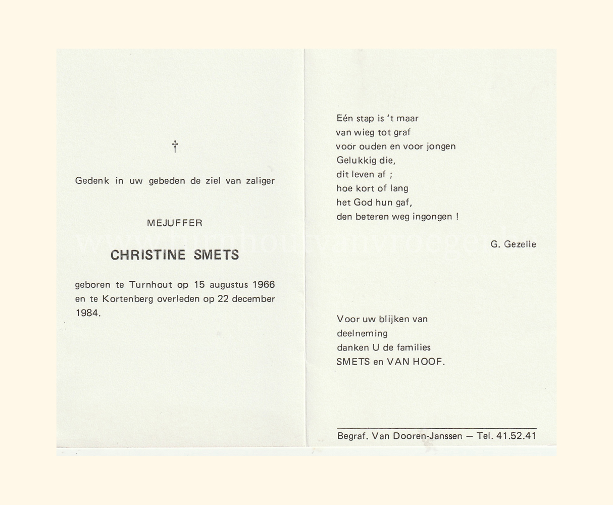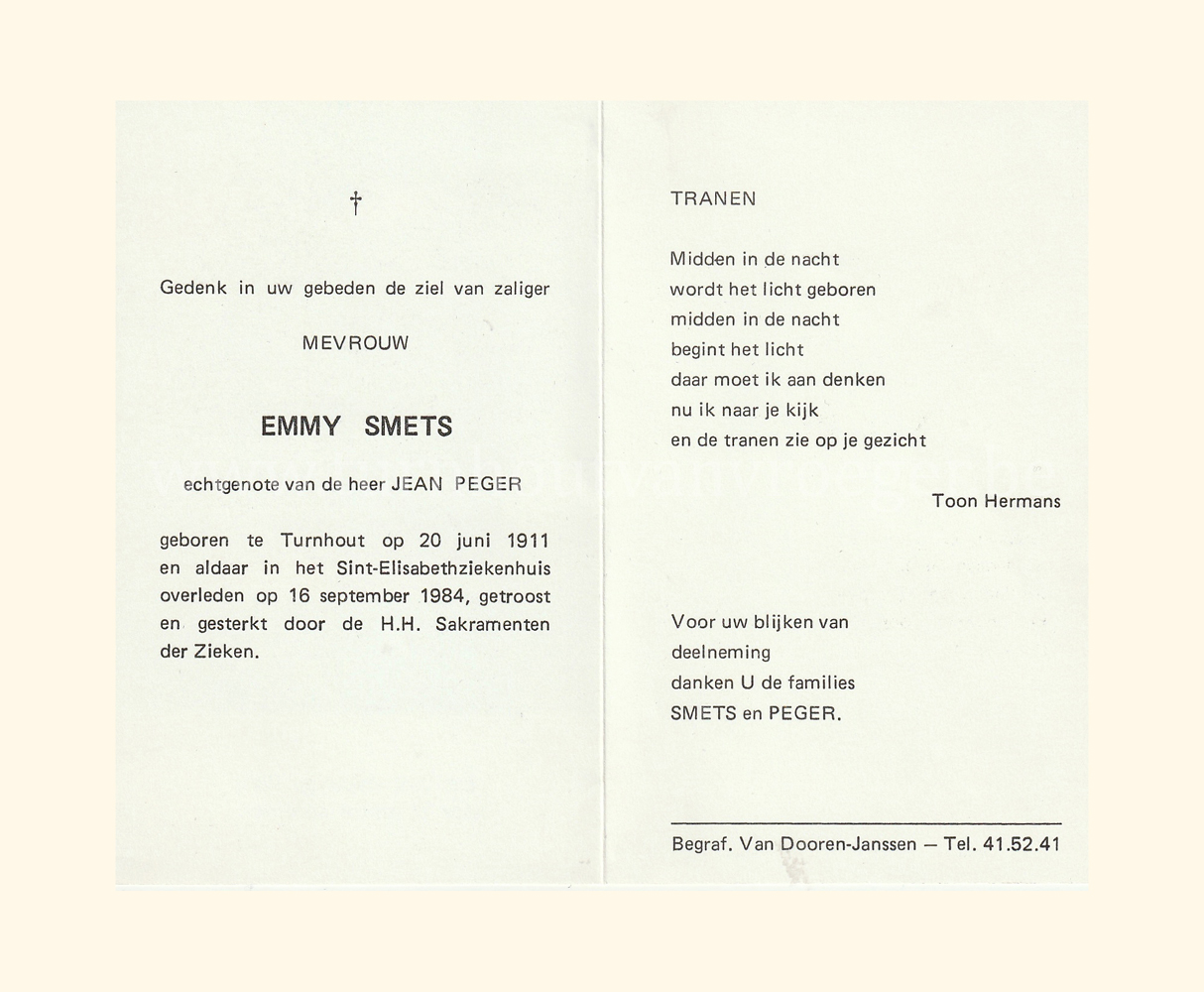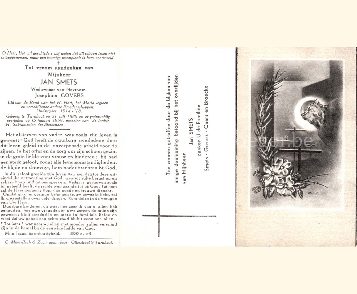 Wij willen met deze website niemand kwetsen of beledigen, het is enkel de bedoeling om genealogische informatie weer te geven. Daarenboven hechten we veel belang aan ieders privacy. Heeft u bezwaar tegen de vermelding van een bidprentje van één van uw familieleden die de afgelopen 50 jaar overleden zijn, stuur dan een mailtje naar info@smartsitesolutions.be.