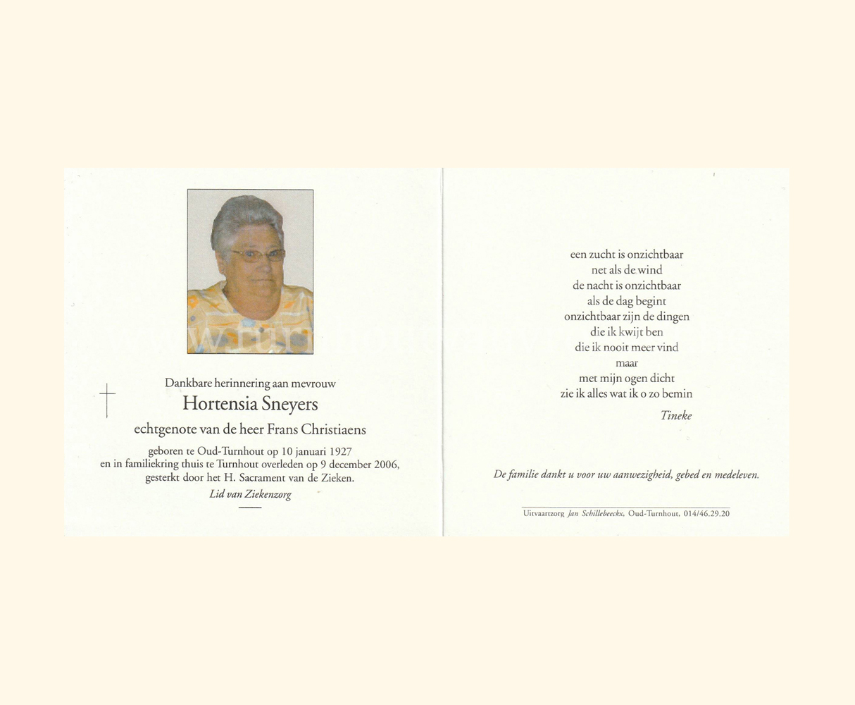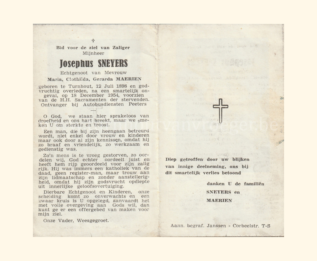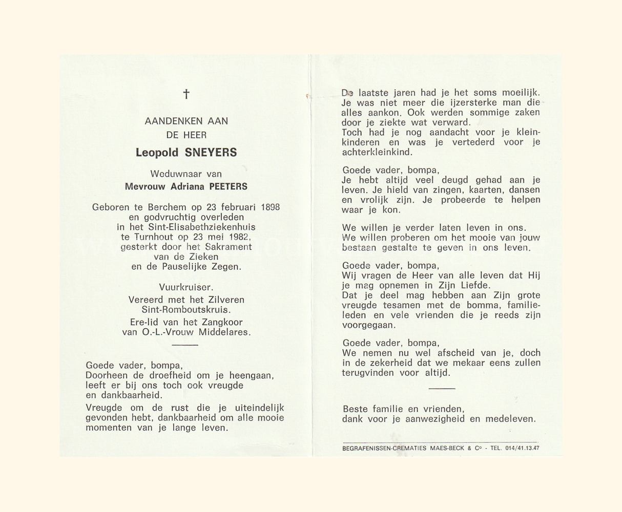 Wij willen met deze website niemand kwetsen of beledigen, het is enkel de bedoeling om genealogische informatie weer te geven.  Daarenboven hechten we veel belang aan ieders privacy.  Heeft u bezwaar tegen de vermelding van een bidprentje van één van uw familieleden die de afgelopen 50 jaar overleden zijn, stuur dan een mailtje naar info@smartsitesolutions.be.