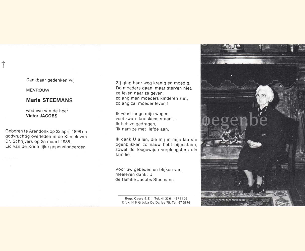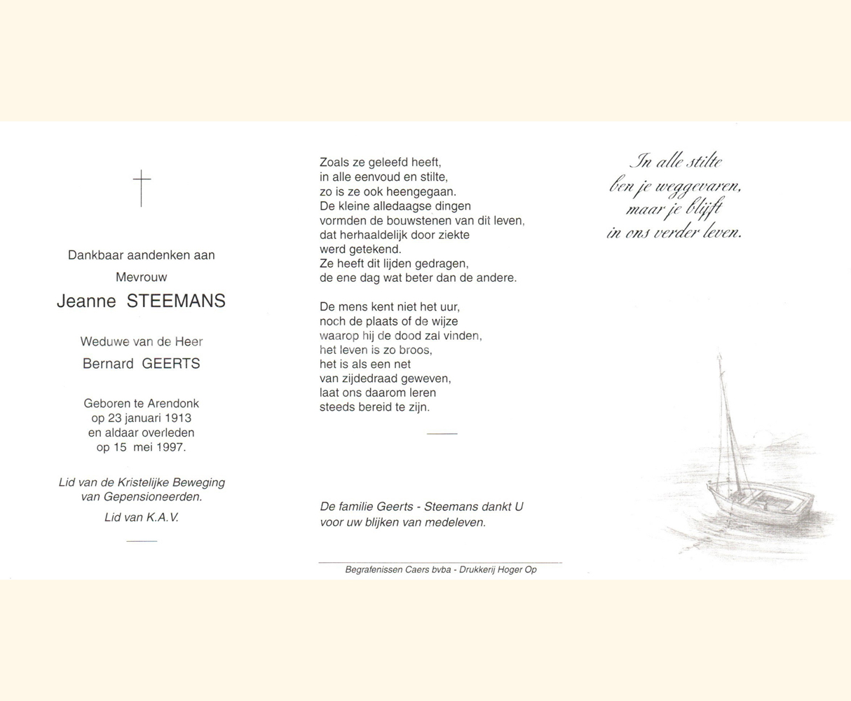 Wij willen met deze website niemand kwetsen of beledigen, het is enkel de bedoeling om genealogische informatie weer te geven.  Daarenboven hechten we veel belang aan ieders privacy.  Heeft u bezwaar tegen de vermelding van een bidprentje van één van uw familieleden die de afgelopen 50 jaar overleden zijn, stuur dan een mailtje naar info@smartsitesolutions.be.