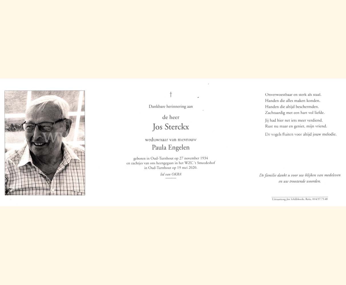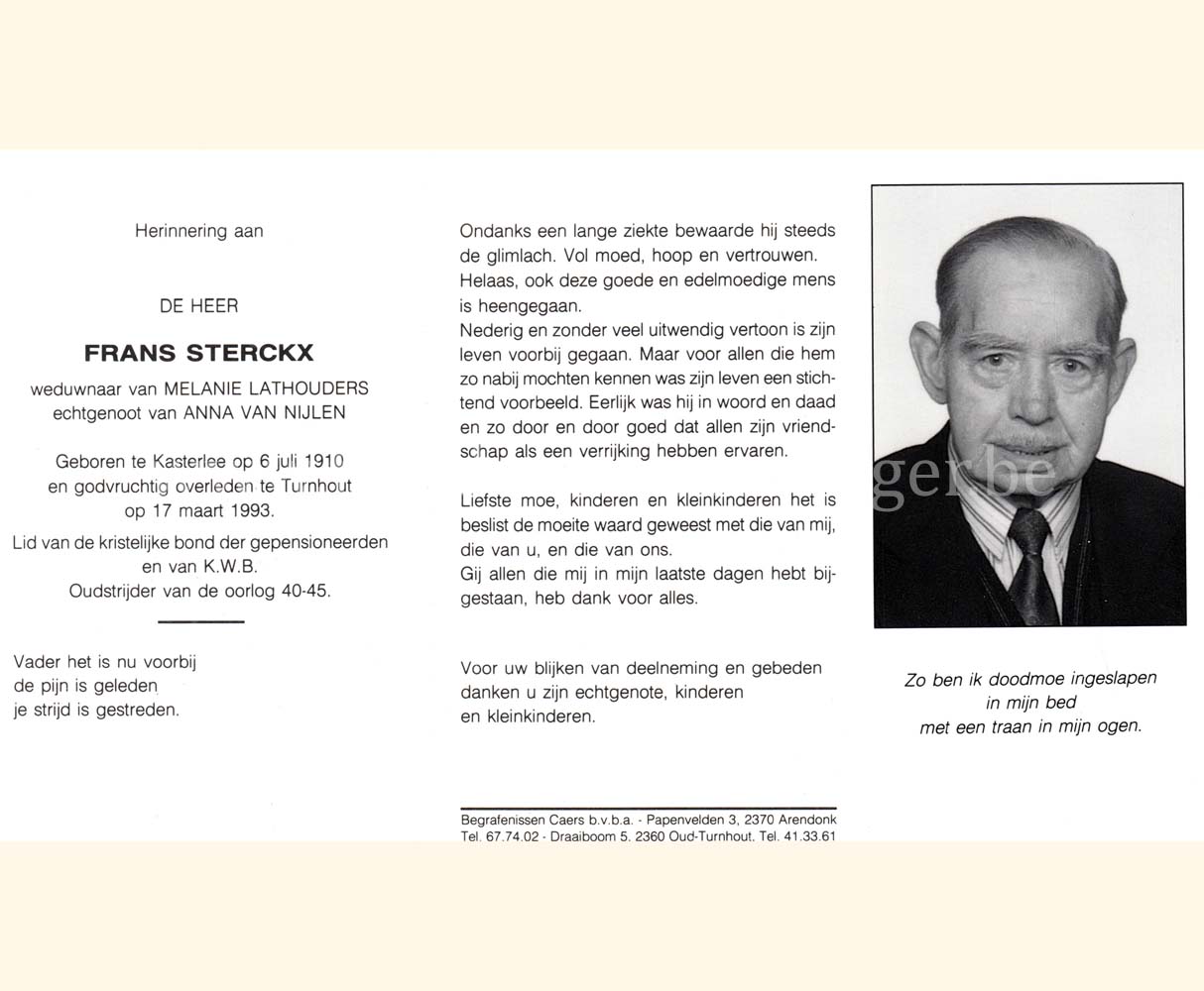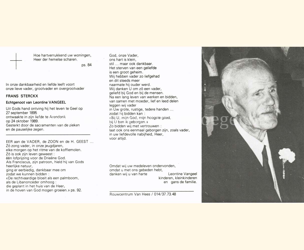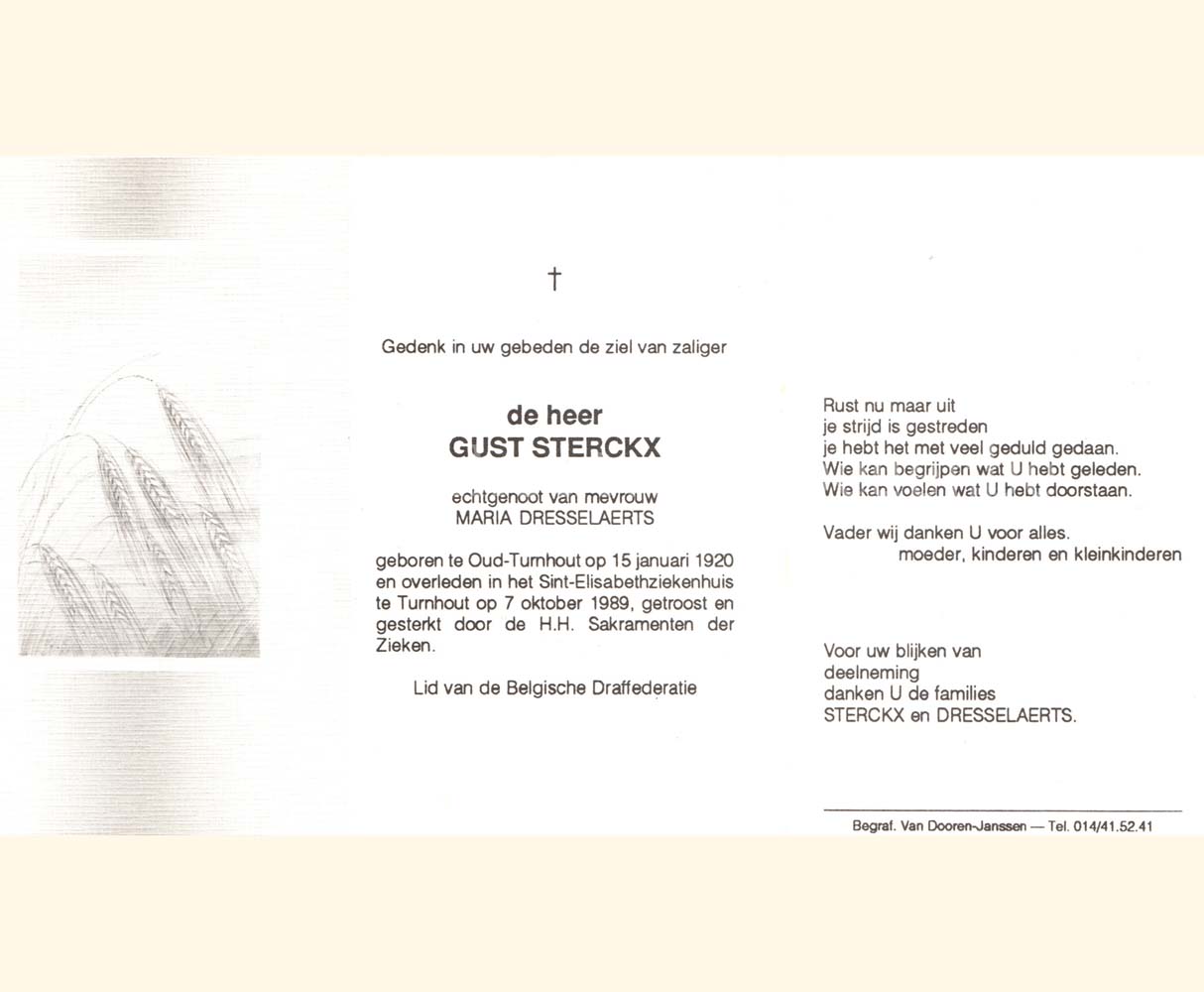 Wij willen met deze website niemand kwetsen of beledigen, het is enkel de bedoeling om genealogische informatie weer te geven.  Daarenboven hechten we veel belang aan ieders privacy.  Heeft u bezwaar tegen de vermelding van een bidprentje van één van uw familieleden die de afgelopen 50 jaar overleden zijn, stuur dan een mailtje naar info@smartsitesolutions.be.