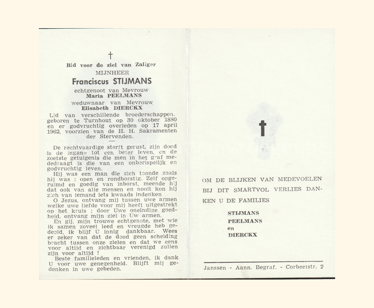 Wij willen met deze website niemand kwetsen of beledigen, het is enkel de bedoeling om genealogische informatie weer te geven.  Daarenboven hechten we veel belang aan ieders privacy.  Heeft u bezwaar tegen de vermelding van een bidprentje van één van uw familieleden die de afgelopen 50 jaar overleden zijn, stuur dan een mailtje naar info@smartsitesolutions.be.