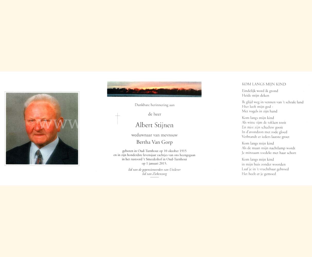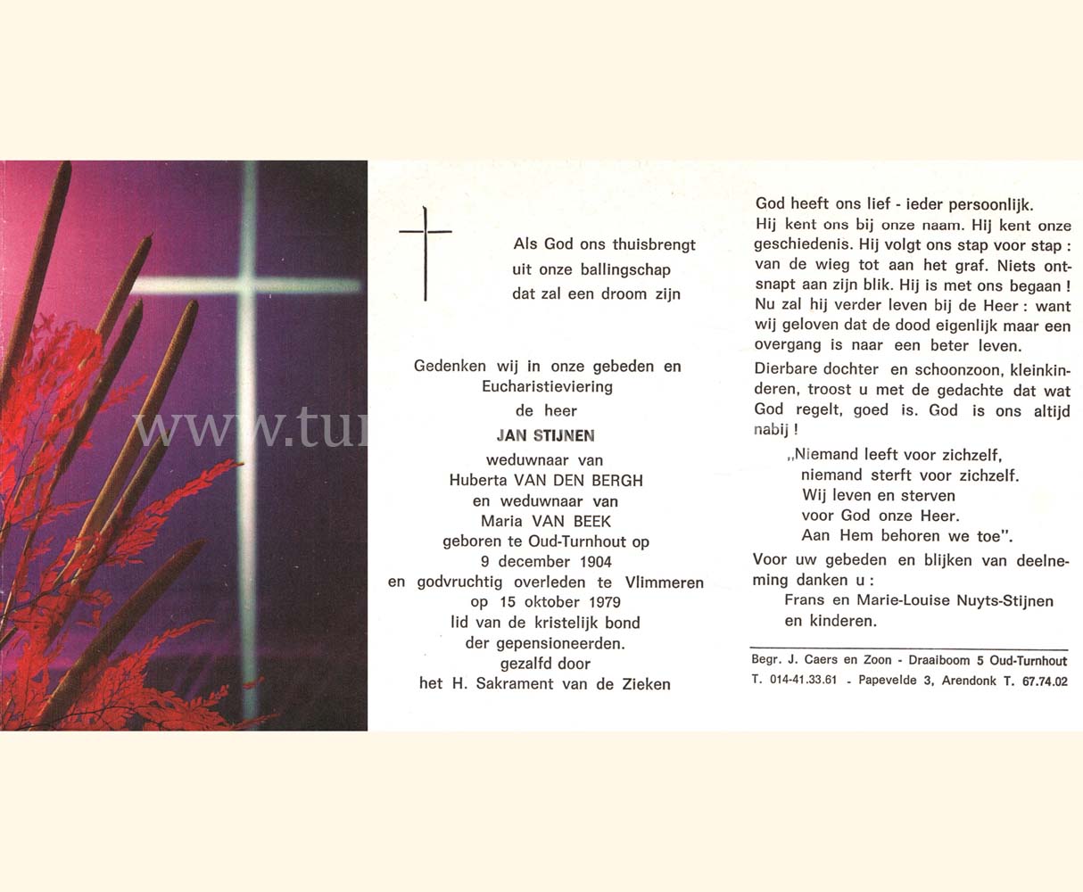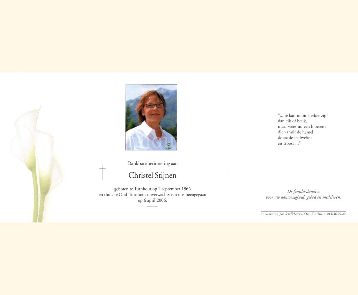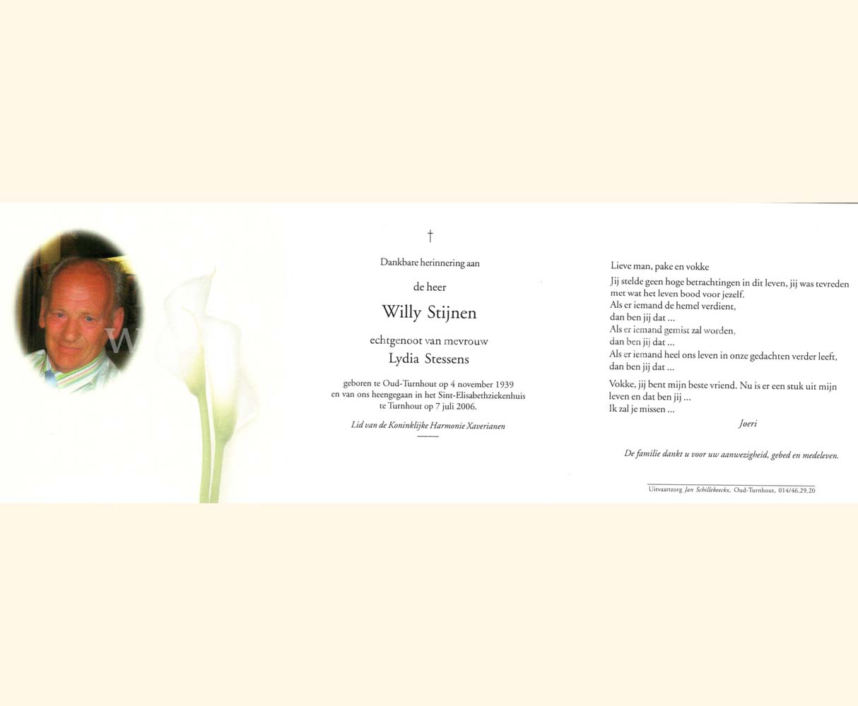 Wij willen met deze website niemand kwetsen of beledigen, het is enkel de bedoeling om genealogische informatie weer te geven.  Daarenboven hechten we veel belang aan ieders privacy.  Heeft u bezwaar tegen de vermelding van een bidprentje van één van uw familieleden die de afgelopen 50 jaar overleden zijn, stuur dan een mailtje naar info@smartsitesolutions.be.