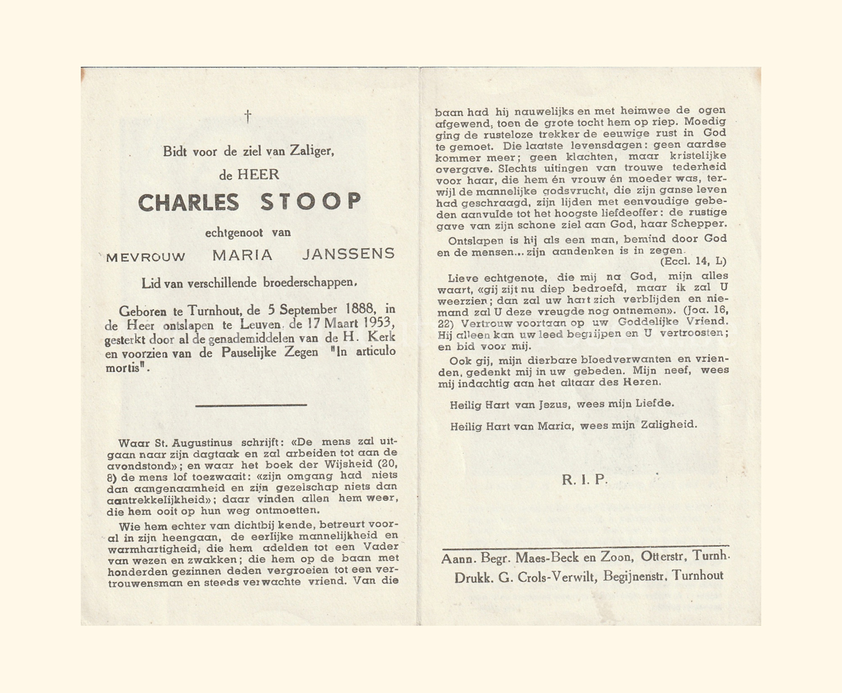 Wij willen met deze website niemand kwetsen of beledigen, het is enkel de bedoeling om genealogische informatie weer te geven.  Daarenboven hechten we veel belang aan ieders privacy.  Heeft u bezwaar tegen de vermelding van een bidprentje van één van uw familieleden die de afgelopen 50 jaar overleden zijn, stuur dan een mailtje naar info@smartsitesolutions.be.