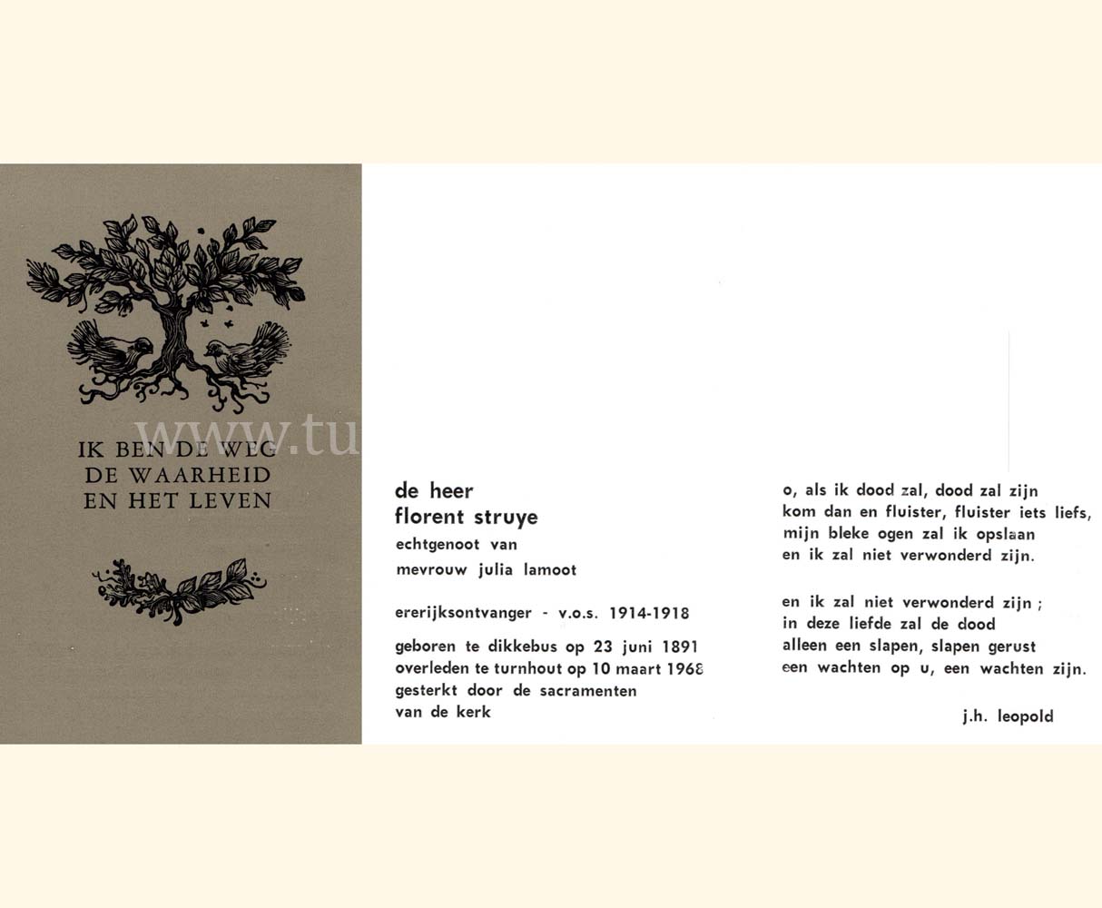 Wij willen met deze website niemand kwetsen of beledigen, het is enkel de bedoeling om genealogische informatie weer te geven.  Daarenboven hechten we veel belang aan ieders privacy.  Heeft u bezwaar tegen de vermelding van een bidprentje van één van uw familieleden die de afgelopen 50 jaar overleden zijn, stuur dan een mailtje naar info@smartsitesolutions.be.