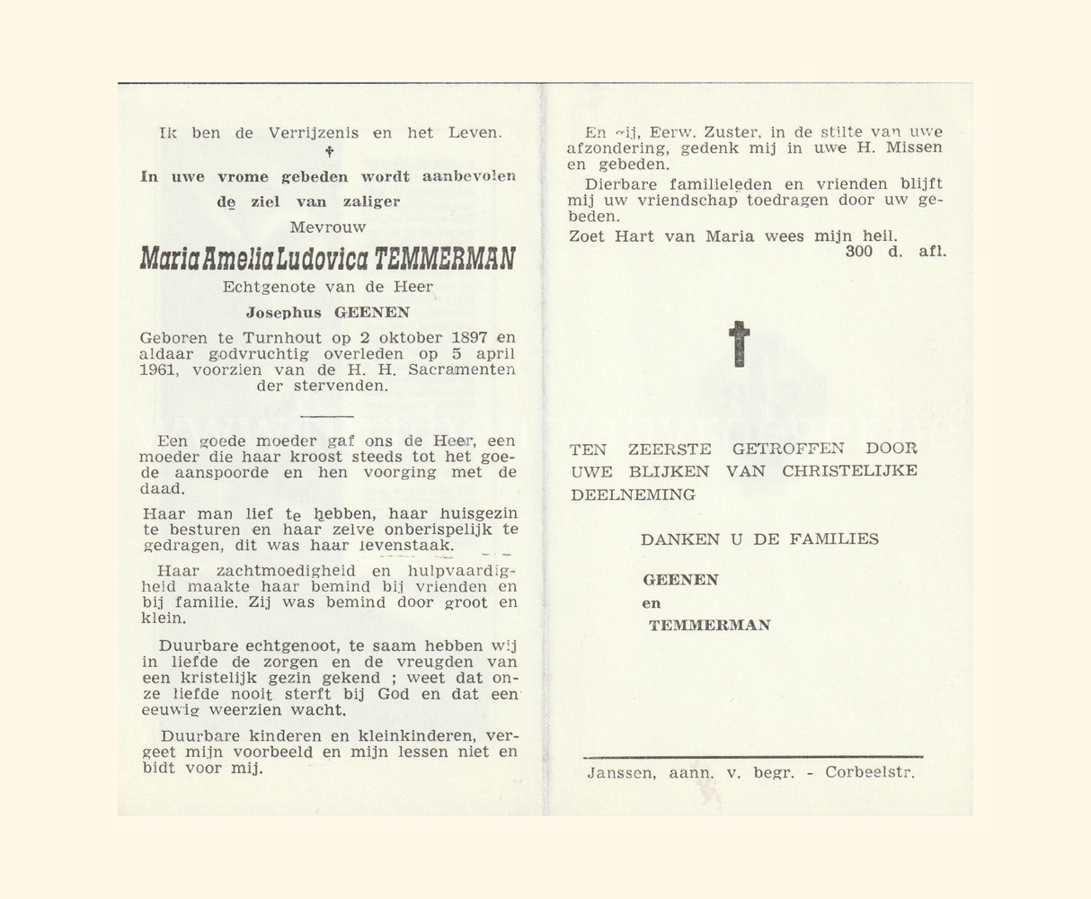 Wij willen met deze website niemand kwetsen of beledigen, het is enkel de bedoeling om genealogische informatie weer te geven.  Daarenboven hechten we veel belang aan ieders privacy.  Heeft u bezwaar tegen de vermelding van een bidprentje van één van uw familieleden die de afgelopen 50 jaar overleden zijn, stuur dan een mailtje naar info@smartsitesolutions.be.