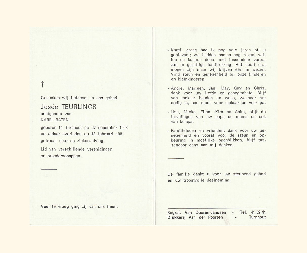 Wij willen met deze website niemand kwetsen of beledigen, het is enkel de bedoeling om genealogische informatie weer te geven.  Daarenboven hechten we veel belang aan ieders privacy.  Heeft u bezwaar tegen de vermelding van een bidprentje van één van uw familieleden die de afgelopen 50 jaar overleden zijn, stuur dan een mailtje naar info@smartsitesolutions.be.