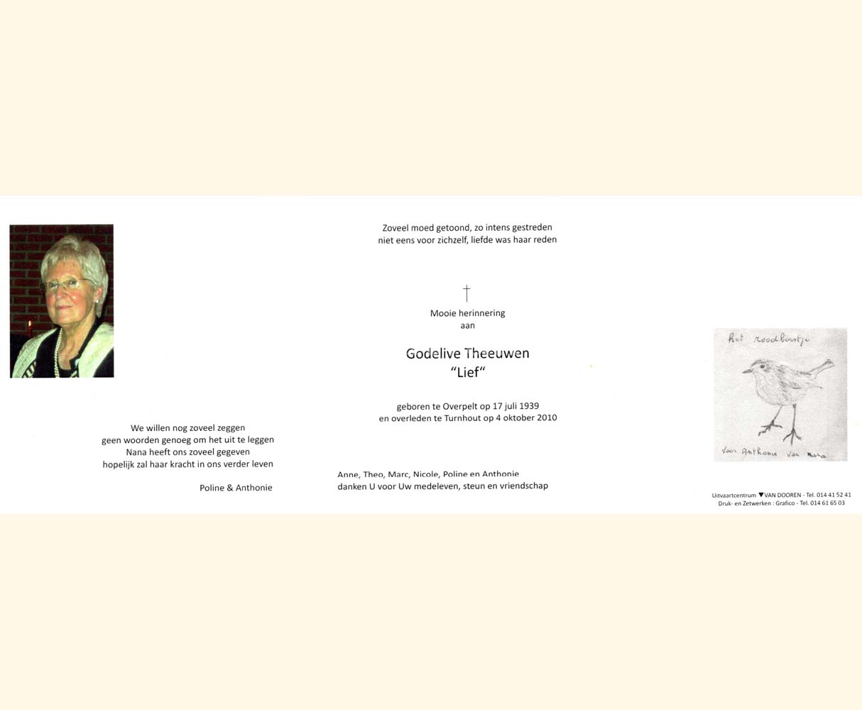 Wij willen met deze website niemand kwetsen of beledigen, het is enkel de bedoeling om genealogische informatie weer te geven.  Daarenboven hechten we veel belang aan ieders privacy.  Heeft u bezwaar tegen de vermelding van een bidprentje van één van uw familieleden die de afgelopen 50 jaar overleden zijn, stuur dan een mailtje naar info@smartsitesolutions.be.