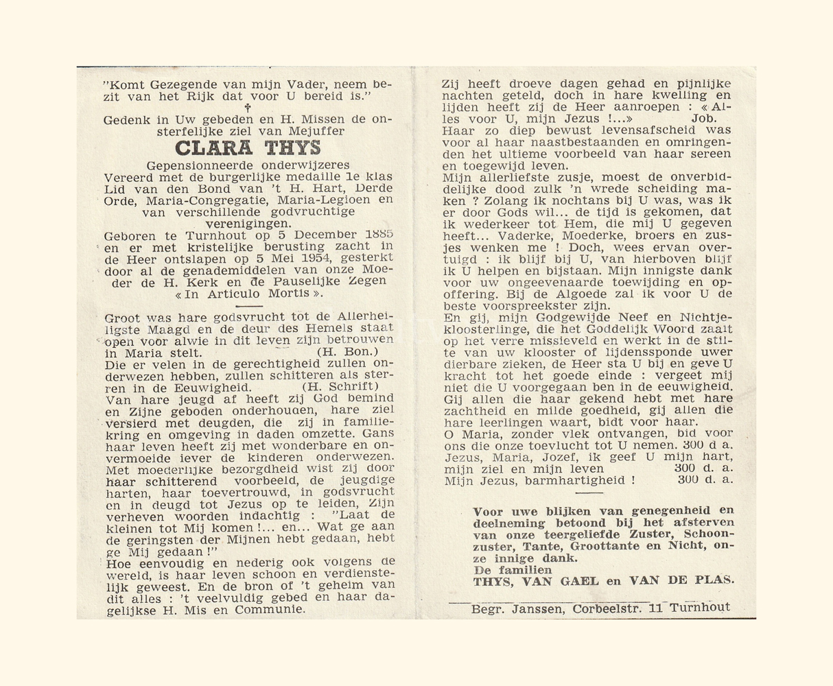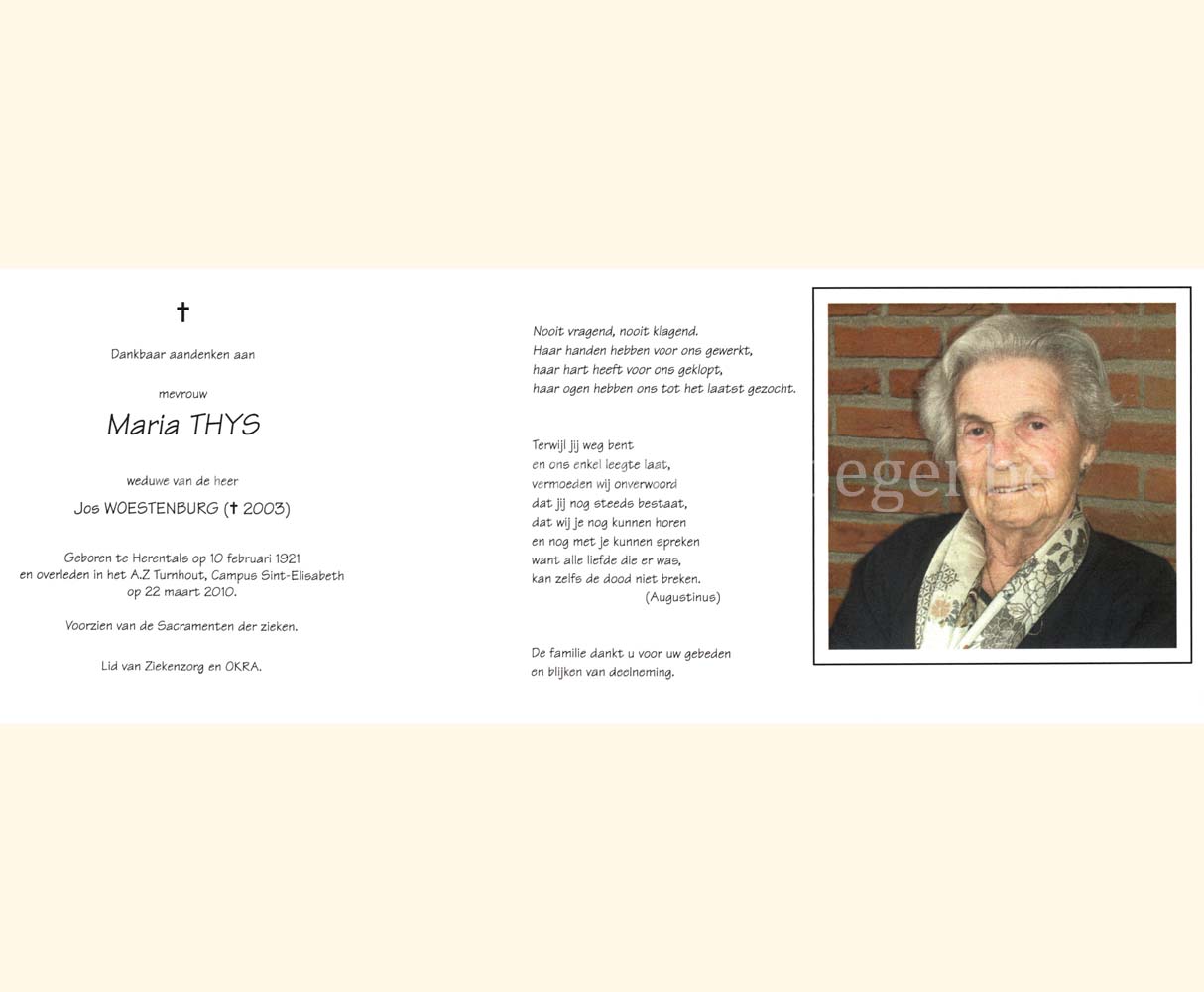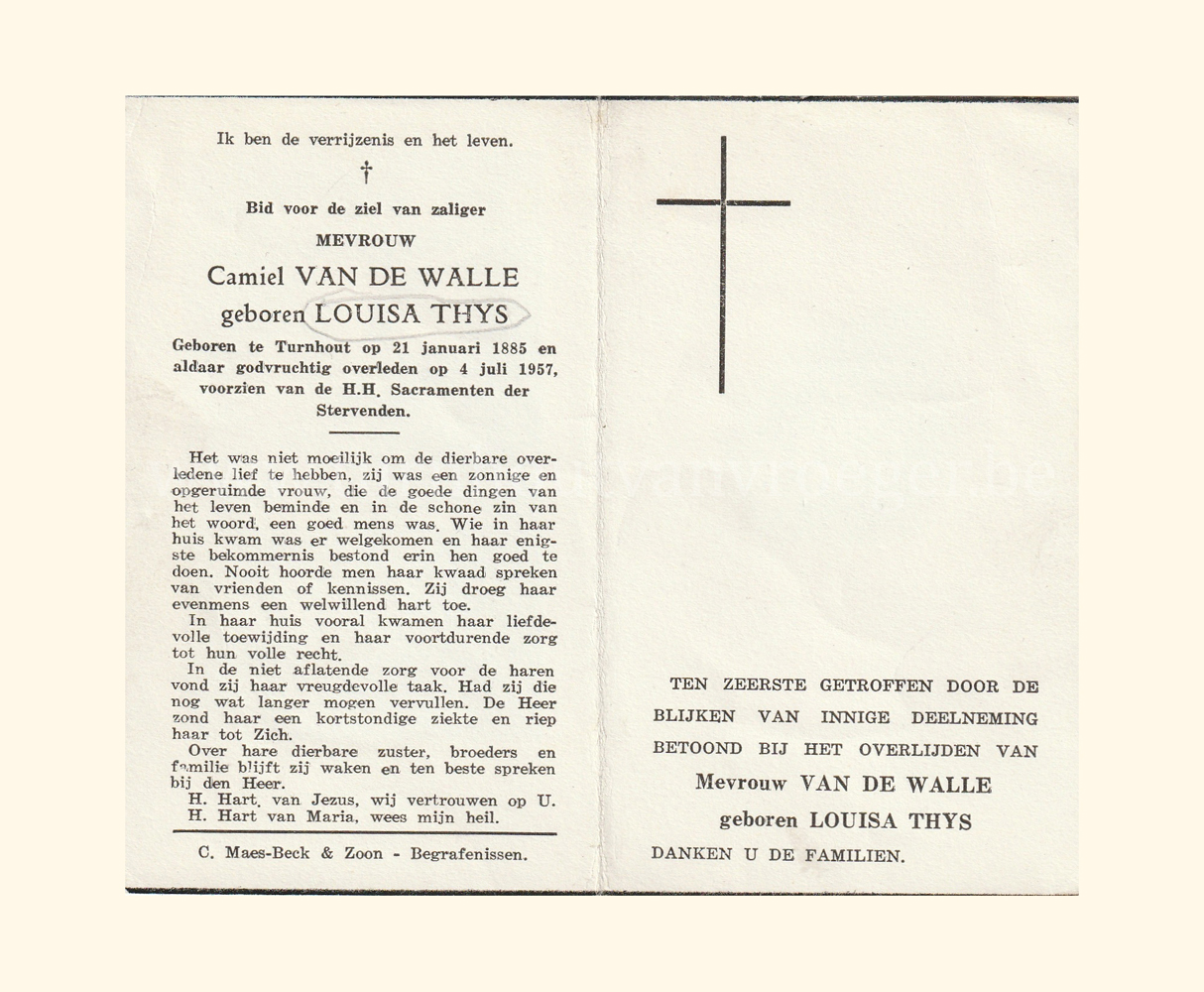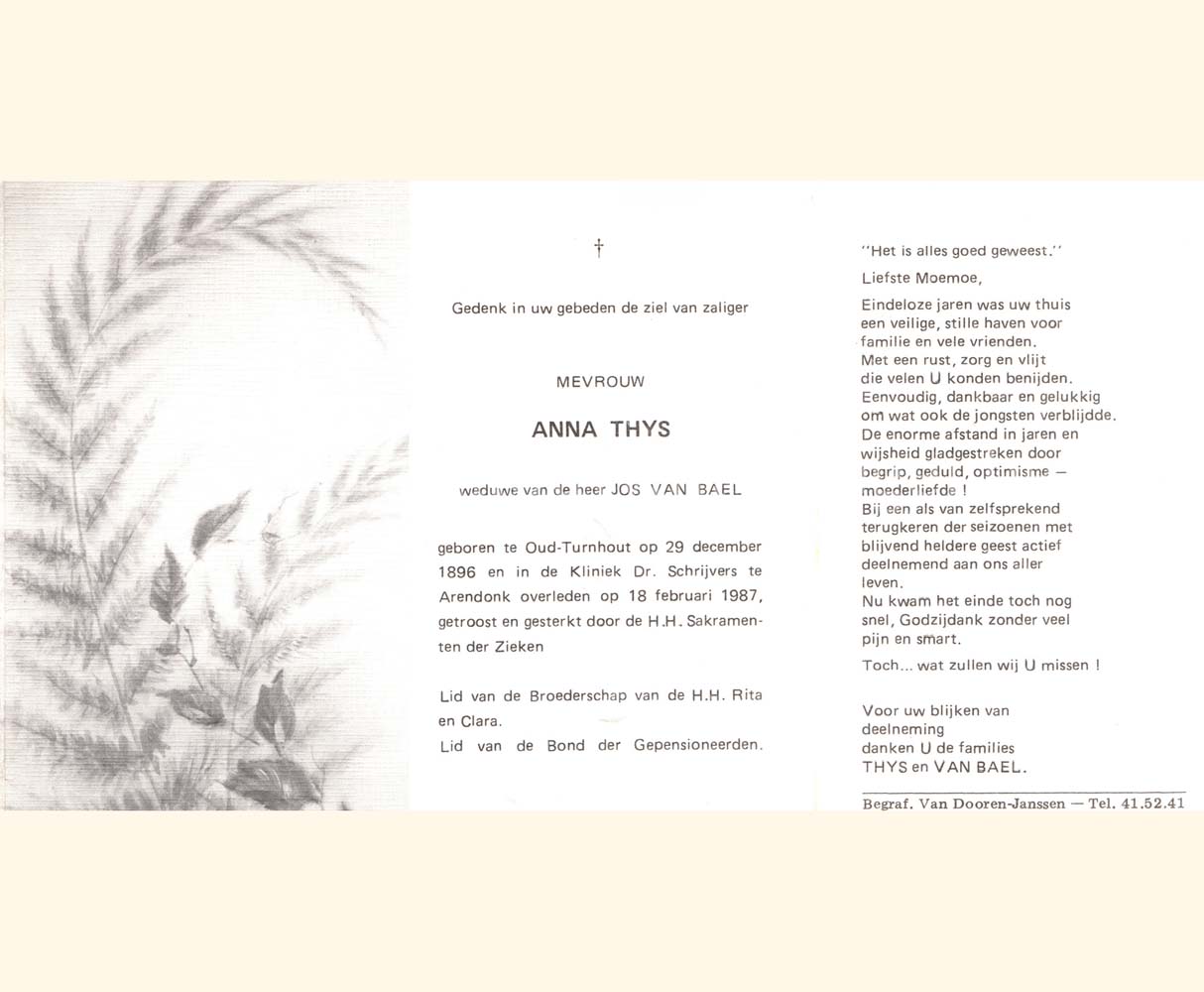 Wij willen met deze website niemand kwetsen of beledigen, het is enkel de bedoeling om genealogische informatie weer te geven.  Daarenboven hechten we veel belang aan ieders privacy.  Heeft u bezwaar tegen de vermelding van een bidprentje van één van uw familieleden die de afgelopen 50 jaar overleden zijn, stuur dan een mailtje naar info@smartsitesolutions.be.