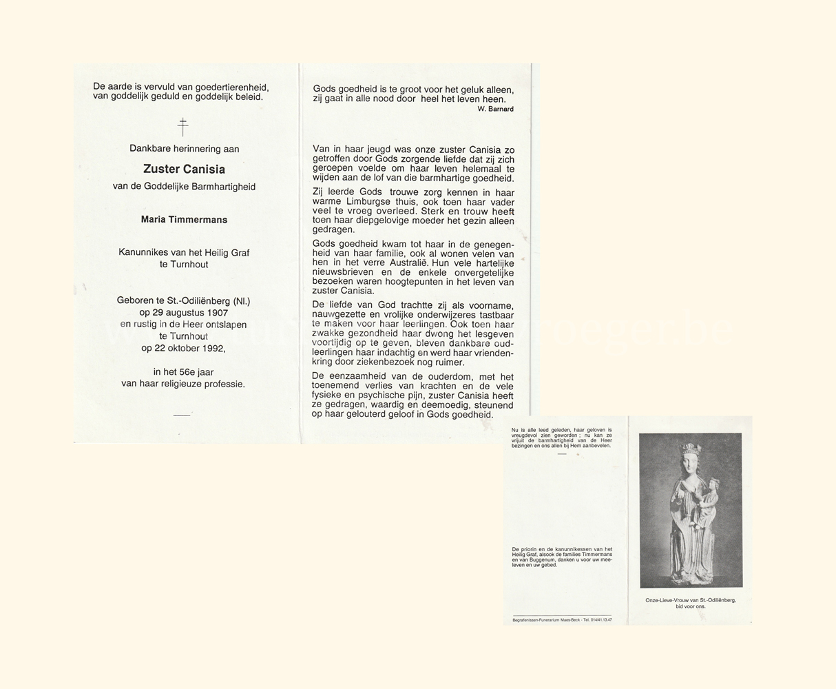 Wij willen met deze website niemand kwetsen of beledigen, het is enkel de bedoeling om genealogische informatie weer te geven.  Daarenboven hechten we veel belang aan ieders privacy.  Heeft u bezwaar tegen de vermelding van een bidprentje van één van uw familieleden die de afgelopen 50 jaar overleden zijn, stuur dan een mailtje naar info@smartsitesolutions.be.
