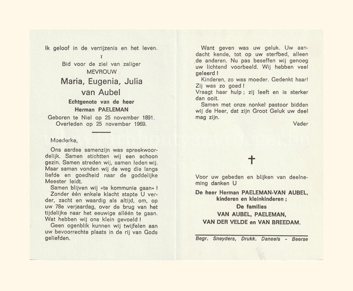 Wij willen met deze website niemand kwetsen of beledigen, het is enkel de bedoeling om genealogische informatie weer te geven.  Daarenboven hechten we veel belang aan ieders privacy.  Heeft u bezwaar tegen de vermelding van een bidprentje van één van uw familieleden die de afgelopen 50 jaar overleden zijn, stuur dan een mailtje naar info@smartsitesolutions.be.
